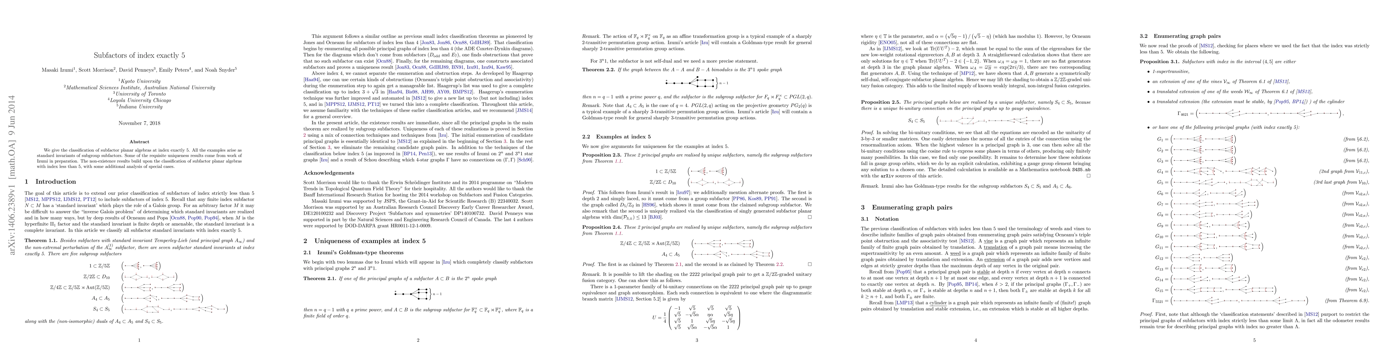This paper classifies subfactor planar algebras with an index of exactly 5, showing that all examples originate from subgroup subfactors, with unique results partially derived from Izumi's work and non-existence results based on previous classifications for indices less than 5.