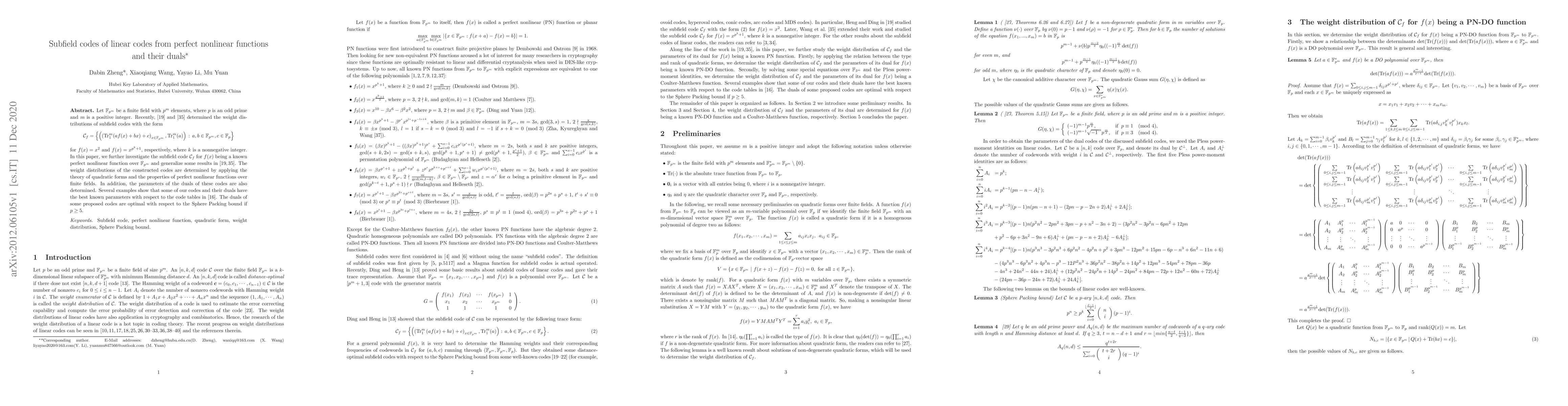 Researchers investigate subfield codes from perfect nonlinear functions, determining their weight distributions and dual parameters, with some examples showing optimal code tables and Sphere Packing bound performance.