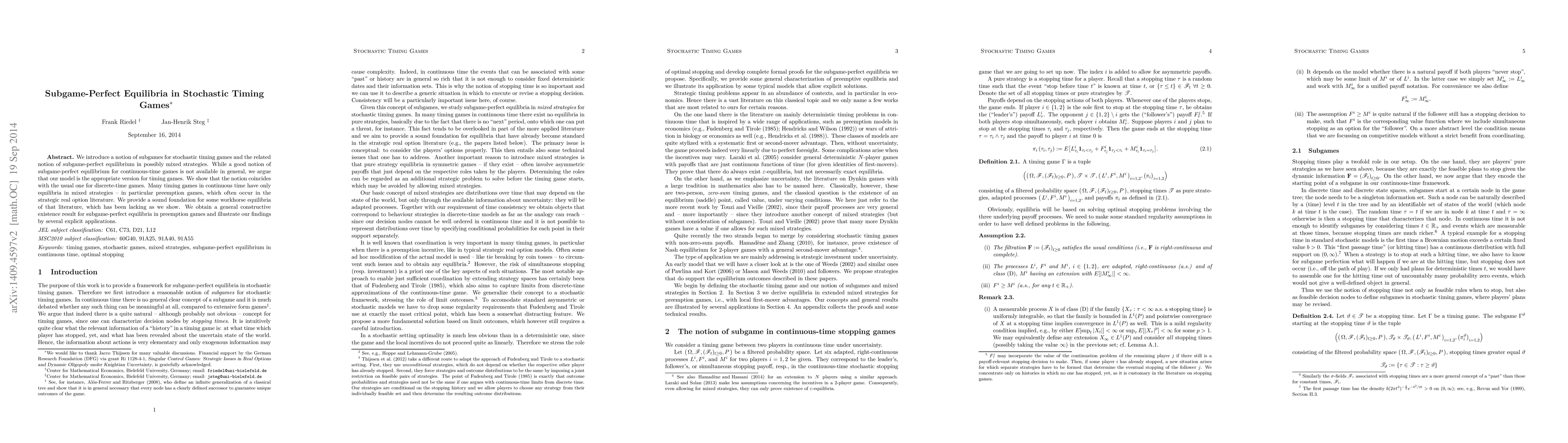 This paper develops a subgame-perfect equilibrium concept for stochastic timing games, particularly focusing on mixed strategies in continuous time. It establishes a constructive existence result for equilibria in preemption games, addressing a foundational gap in the strategic real option literature.