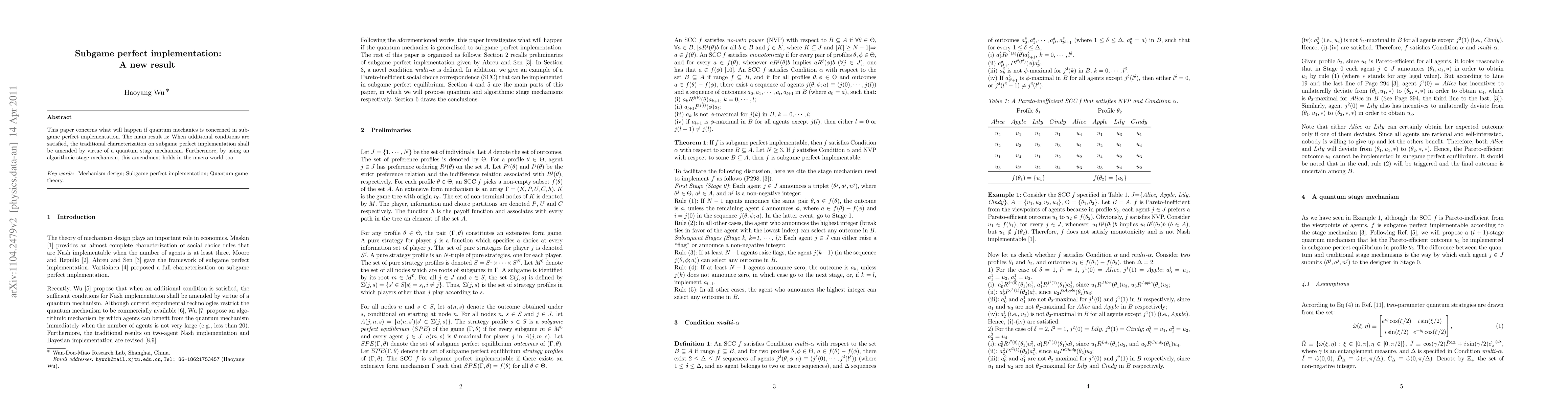 Researchers found that when quantum mechanics is incorporated into subgame perfect implementation, additional conditions can alter the traditional characterization of subgame perfect implementation. This new understanding also applies to macro-level applications using algorithmic stage mechanisms.