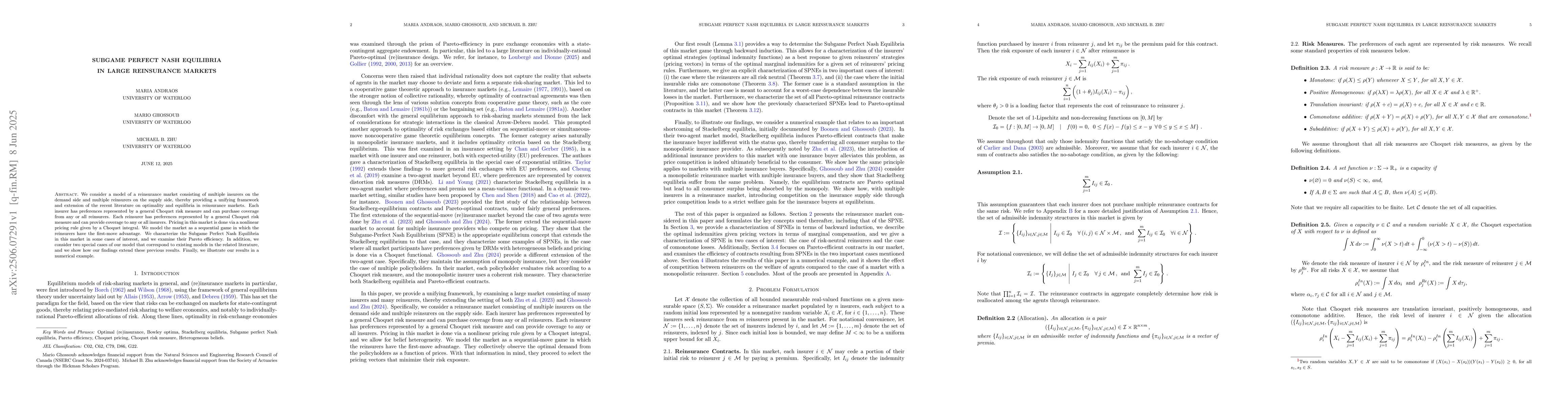 We consider a model of a reinsurance market consisting of multiple insurers on the demand side and multiple reinsurers on the supply side, thereby providing a unifying framework and extension of the recent literature on optimality and equilibria in reinsurance markets. Each insurer has preferences represented by a general Choquet risk measure and can purchase coverage from any or all reinsurers. Each reinsurer has preferences represented by a general Choquet risk measure and can provide coverage to any or all insurers. Pricing in this market is done via a nonlinear pricing rule given by a Choquet integral. We model the market as a sequential game in which the reinsurers have the first-move advantage. We characterize the Subgame Perfect Nash Equilibria in this market in some cases of interest, and we examine their Pareto efficiency. In addition, we consider two special cases of our model that correspond to existing models in the related literature, and we show how our findings extend these previous results. Finally, we illustrate our results in a numerical example.