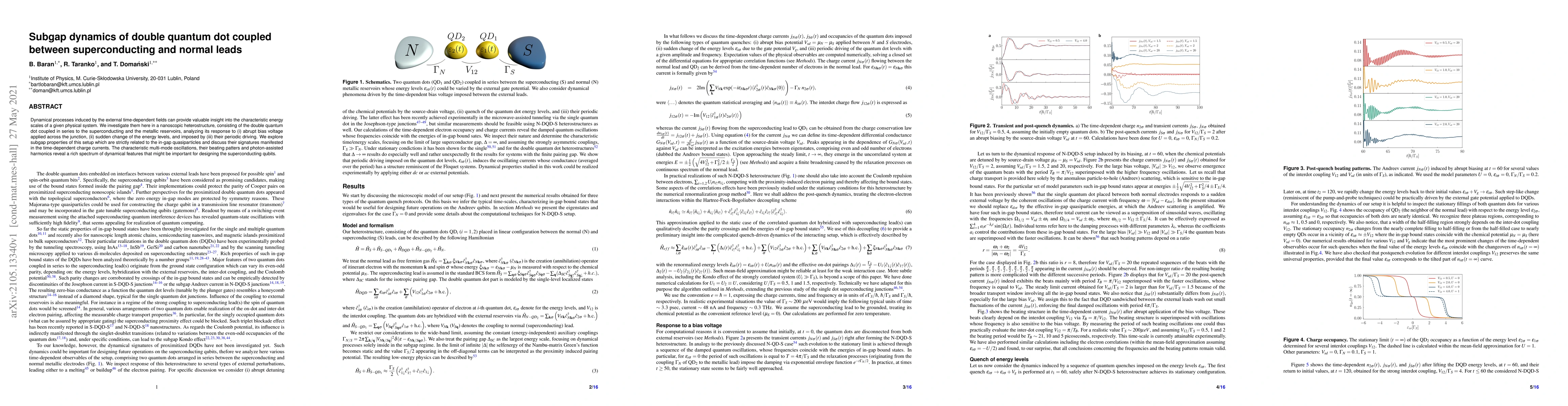 This paper investigates the dynamics of a double quantum dot connected to superconducting and normal leads under various external perturbations. It explores subgap properties and their influence on time-dependent charge currents, revealing multi-mode oscillations and photon-assisted harmonics that could inform the design of superconducting qubits.