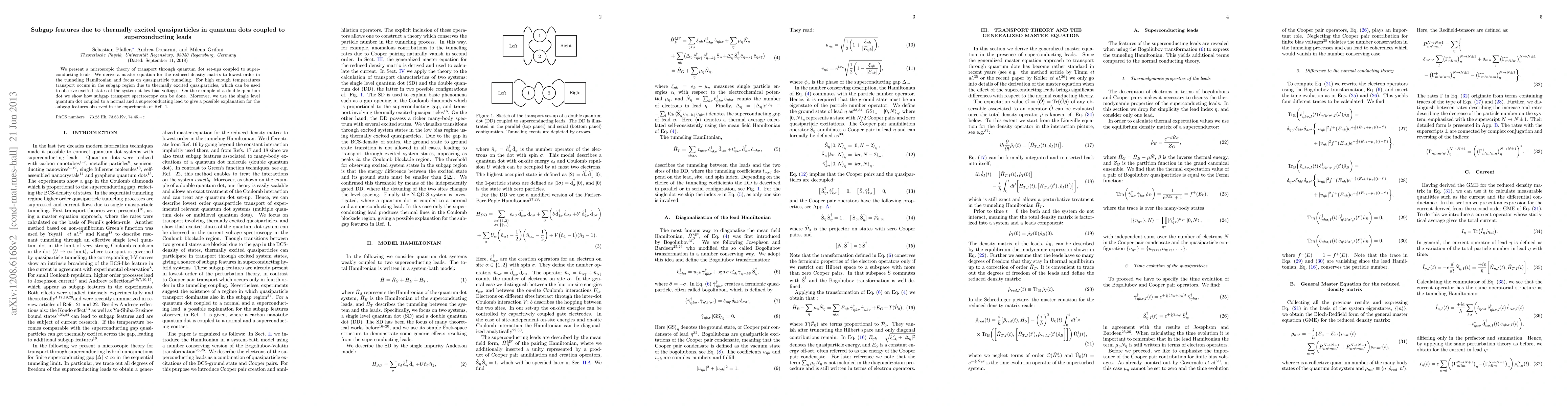 The research presents a microscopic theory of transport through quantum dot setups coupled to superconducting leads, deriving a master equation for the reduced density matrix to lowest order in the tunneling Hamiltonian, focusing on quasiparticle tunneling.