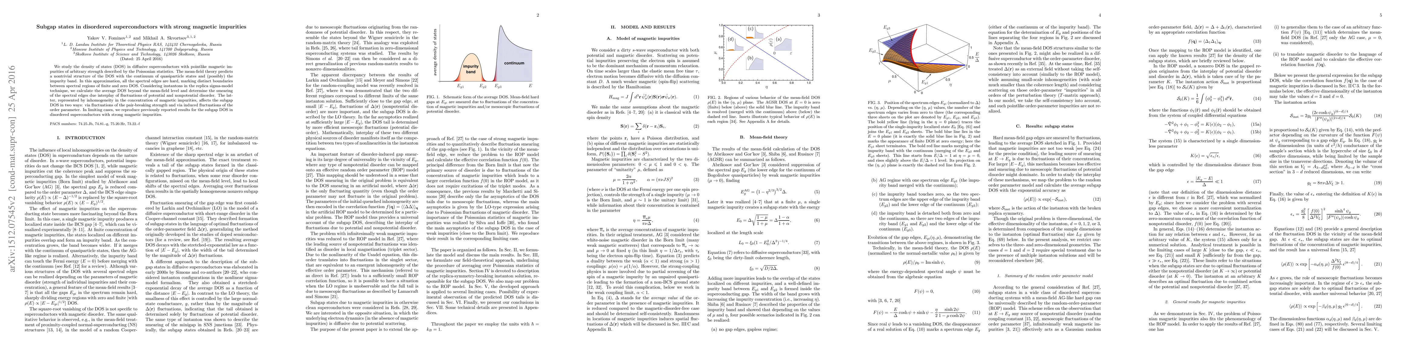 This paper investigates the density of states in disordered superconductors with strong magnetic impurities, revealing a continuum of quasiparticle states and an impurity band. It uses the replica sigma-model technique to calculate the average density of states beyond mean-field theory, showing that fluctuations due to magnetic impurities affect the subgap states by altering both pair-breaking strength and order parameter fluctuations.