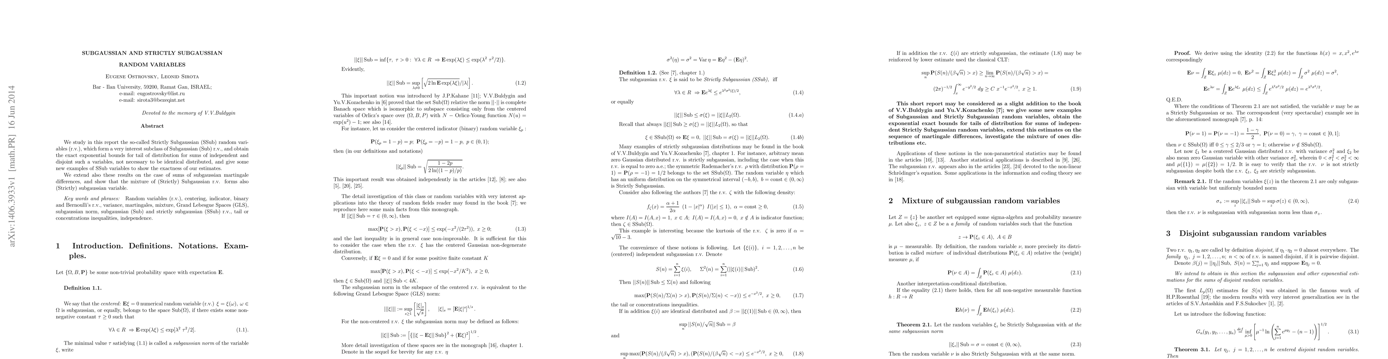 We study in this report the so-called Strictly Subgaussian (SSub) random variables (r.v.), which form a very interest subclass of Subgaussian (Sub) r.v., and obtain the exact exponential bounds for tail of distribution for sums of independent and disjoint such a variables, not necessary to be identical distributed, and give some new examples of SSub variables to show the exactness of our estimates. We extend also these results on the case of sums of subgaussian martingale differences, and show that the mixture of (Strictly) Subgaussian r.v. forms also (Strictly) subgaussian variable.