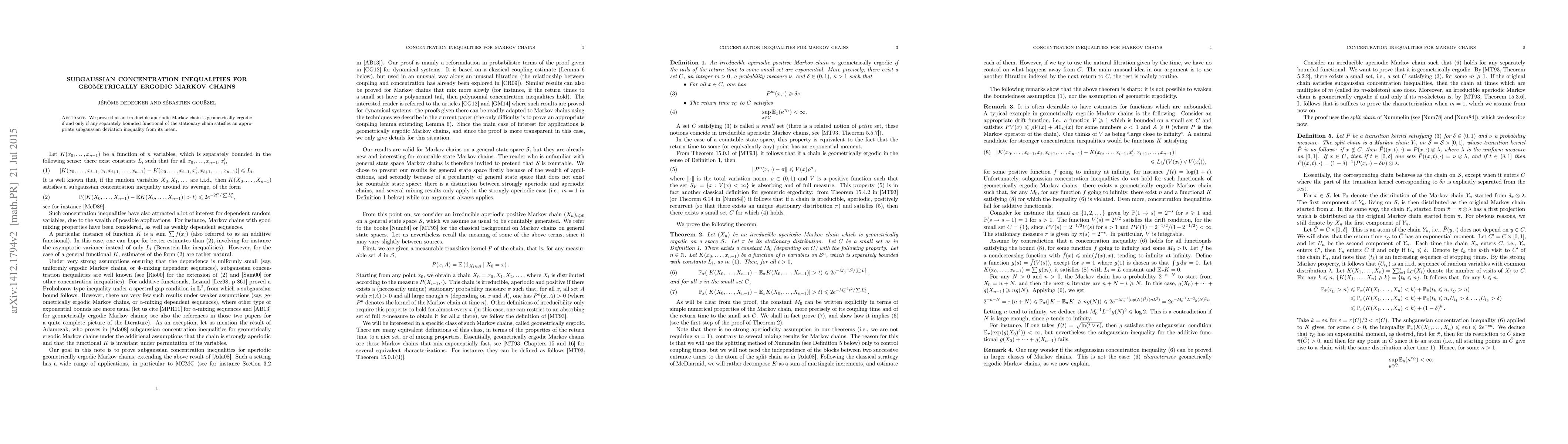 Summary: This paper establishes that a Markov chain is geometrically ergodic if and only if all separately bounded functionals of its stationary distribution satisfy subgaussian concentration inequalities around their means. The result provides a new characterization of geometric ergodicity.