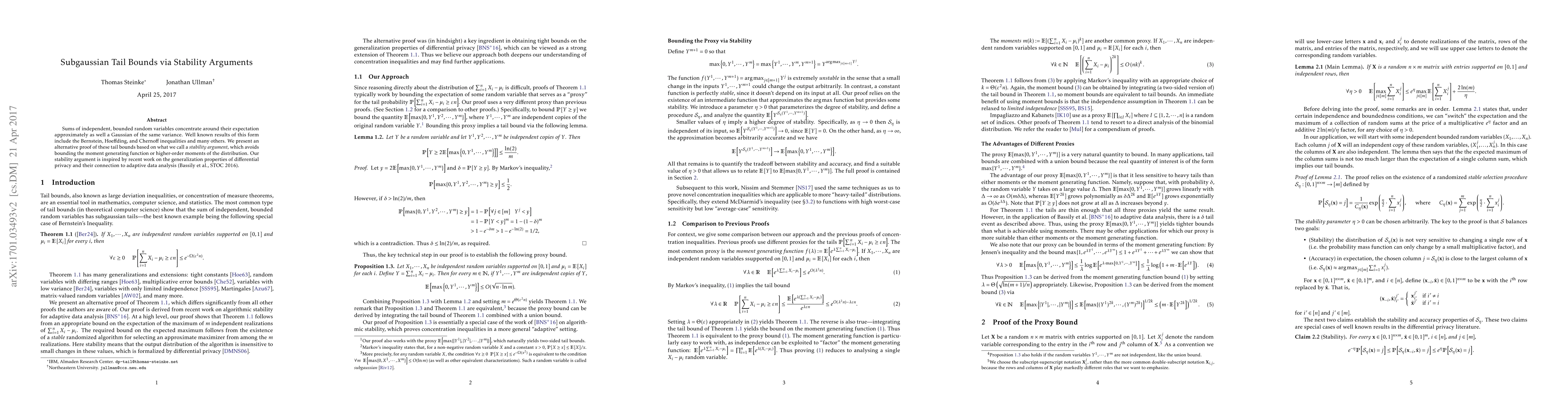 Sums of independent, bounded random variables concentrate around their expectation approximately as well a Gaussian of the same variance. Well known results of this form include the Bernstein, Hoeffding, and Chernoff inequalities and many others. We present an alternative proof of these tail bounds based on what we call a stability argument, which avoids bounding the moment generating function or higher-order moments of the distribution. Our stability argument is inspired by recent work on the generalization properties of differential privacy and their connection to adaptive data analysis (Bassily et al., STOC 2016).
