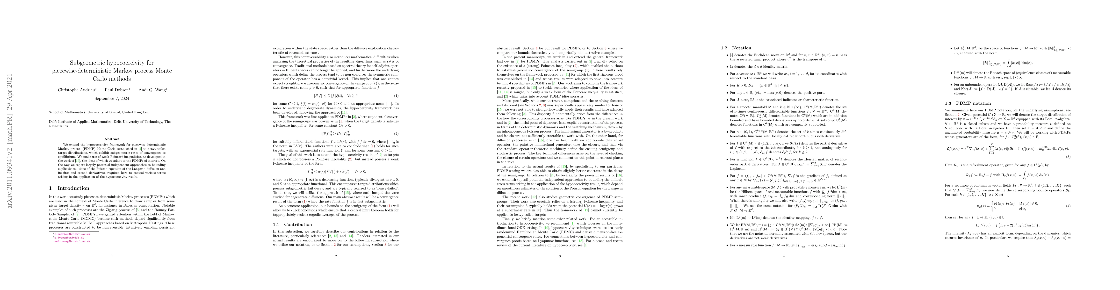 This paper extends hypocoercivity analysis for piecewise-deterministic Markov process (PDMP) Monte Carlo methods to heavy-tailed distributions, achieving subgeometric convergence rates. It utilizes weak Poincaré inequalities to control terms in the hypocoercivity framework, adapting these methods for PDMPs.