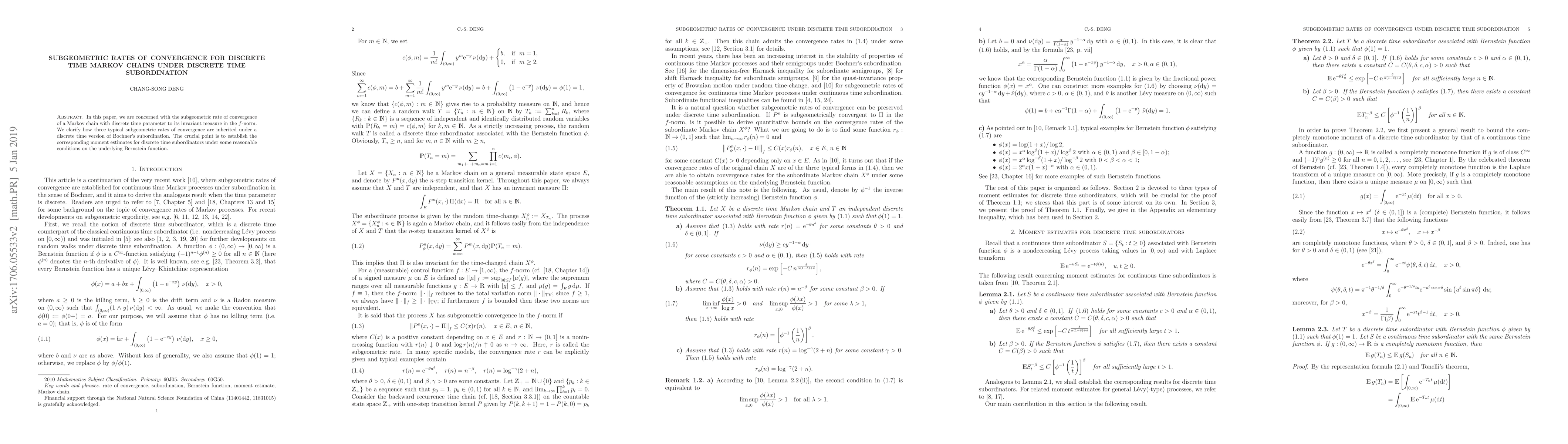This paper investigates the subgeometric convergence rates of discrete time Markov chains under discrete time subordination, clarifying how three common subgeometric rates are inherited. It establishes moment estimates for discrete time subordinators based on conditions on the underlying Bernstein function.