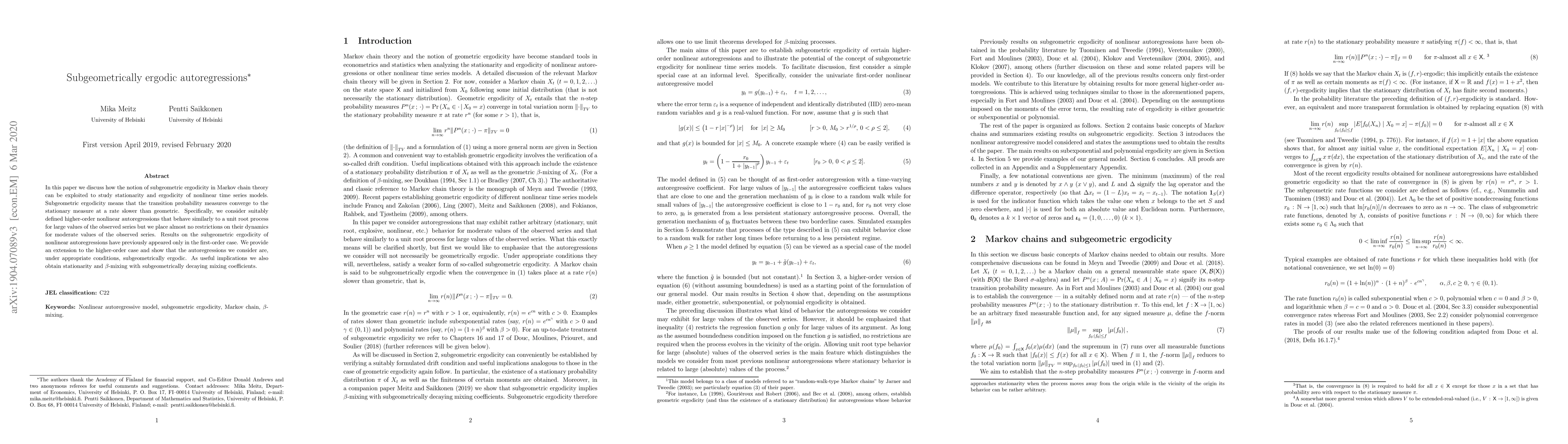 This paper extends the concept of subgeometric ergodicity to higher-order nonlinear autoregressions, demonstrating their stationarity and ergodic properties under specific conditions. It provides results previously only available for first-order autoregressions, showing $\beta$-mixing with subgeometrically decaying mixing coefficients.