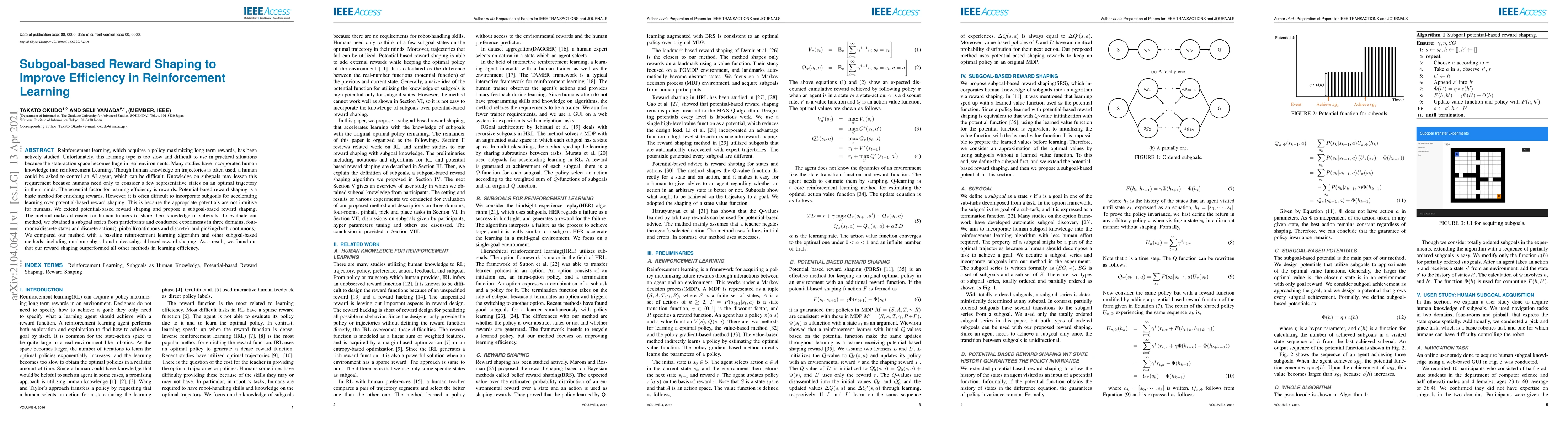 This paper proposes a subgoal-based reward shaping method to enhance reinforcement learning efficiency, making it easier for humans to share subgoal knowledge. Experiments across three domains showed that the method outperformed baseline and other subgoal-based methods in learning efficiency.