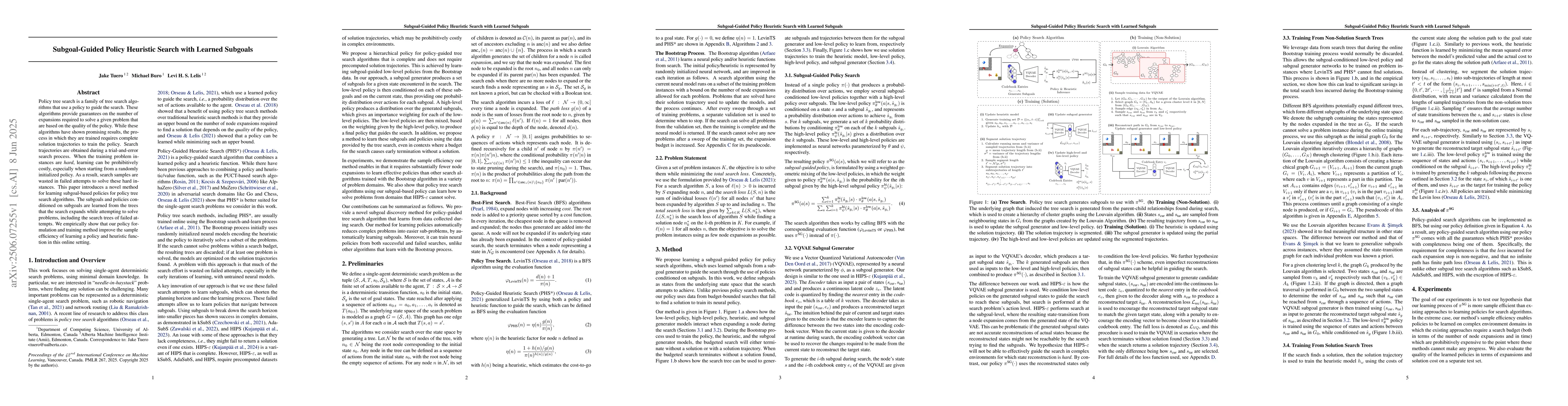 Policy tree search is a family of tree search algorithms that use a policy to guide the search. These algorithms provide guarantees on the number of expansions required to solve a given problem that are based on the quality of the policy. While these algorithms have shown promising results, the process in which they are trained requires complete solution trajectories to train the policy. Search trajectories are obtained during a trial-and-error search process. When the training problem instances are hard, learning can be prohibitively costly, especially when starting from a randomly initialized policy. As a result, search samples are wasted in failed attempts to solve these hard instances. This paper introduces a novel method for learning subgoal-based policies for policy tree search algorithms. The subgoals and policies conditioned on subgoals are learned from the trees that the search expands while attempting to solve problems, including the search trees of failed attempts. We empirically show that our policy formulation and training method improve the sample efficiency of learning a policy and heuristic function in this online setting.