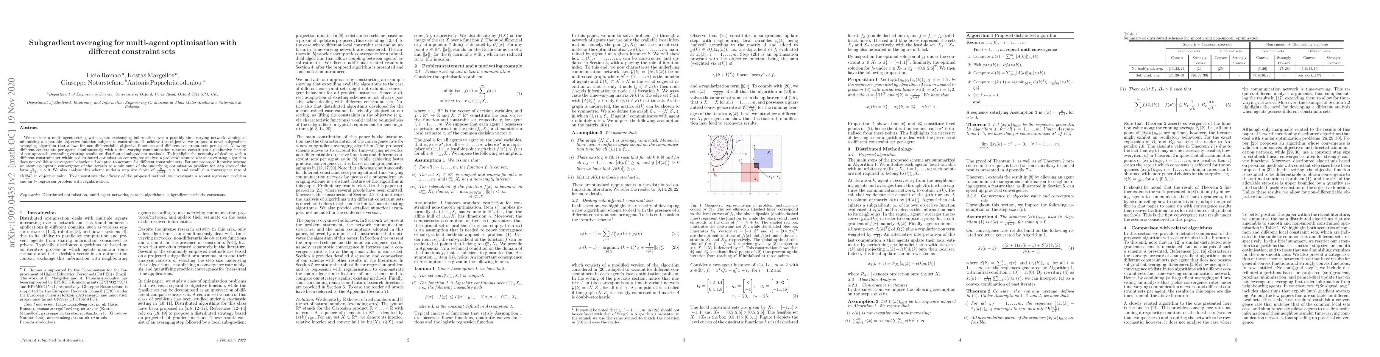 We consider a multi-agent setting with agents exchanging information over a possibly time-varying network, aiming at minimising a separable objective function subject to constraints. To achieve this objective we propose a novel subgradient averaging algorithm that allows for non-differentiable objective functions and different constraint sets per agent. Allowing different constraints per agent simultaneously with a time-varying communication network constitutes a distinctive feature of our approach, extending existing results on distributed subgradient methods. To highlight the necessity of dealing with a different constraint set within a distributed optimisation context, we analyse a problem instance where an existing algorithm does not exhibit a convergent behaviour if adapted to account for different constraint sets. For our proposed iterative scheme we show asymptotic convergence of the iterates to a minimum of the underlying optimisation problem for step sizes of the form $ \frac{\eta}{k+1} $, $ \eta > 0 $. We also analyse this scheme under a step size choice of $ \frac{\eta}{\sqrt{k+1}} $, $ \eta > 0 $, and establish a convergence rate of $ \mathcal{O}(\frac{\ln k}{\sqrt{k}}) $ in objective value. To demonstrate the efficacy of the proposed method, we investigate a robust regression problem and an $ \ell_2 $ regression problem with regularisation.