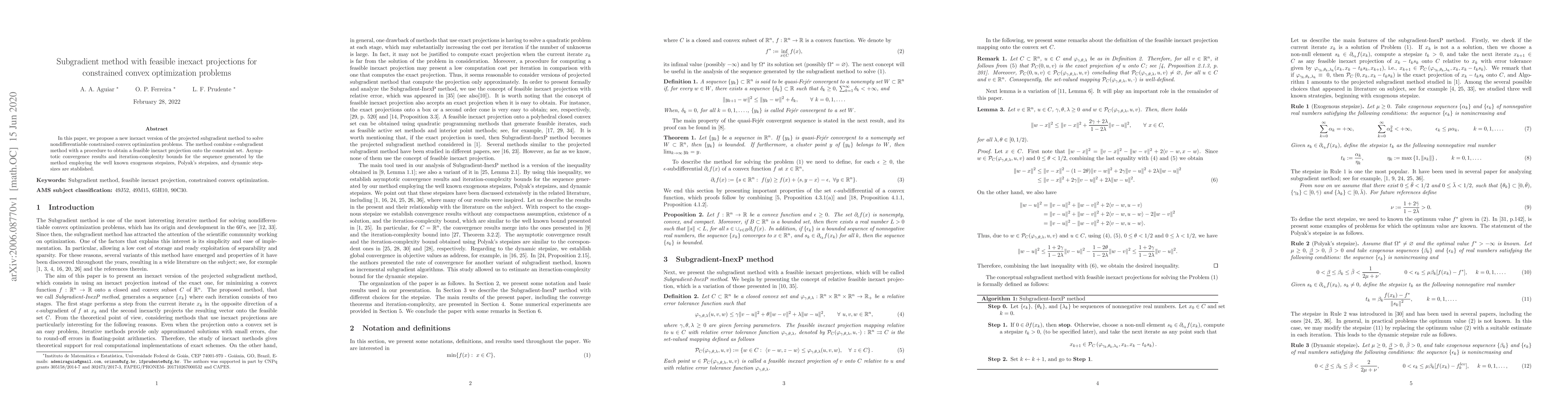 This paper introduces an inexact projected subgradient method for solving nondifferentiable constrained convex optimization problems, combining $\epsilon$-subgradient and feasible inexact projections. It establishes convergence and iteration-complexity bounds for various stepsize rules.
