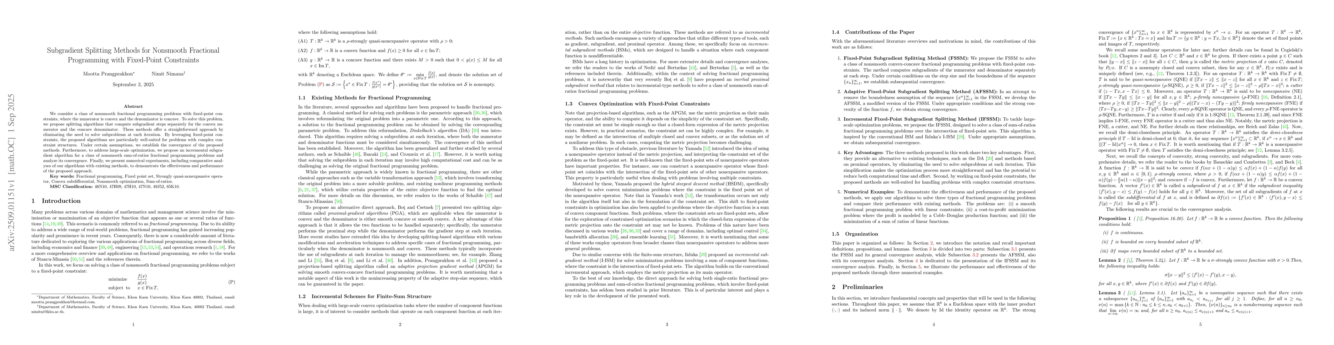 We consider a class of nonsmooth fractional programming problems with fixed-point constraints, where the numerator is convex and the denominator is concave. To solve this problem, we propose splitting algorithms that compute subgradient steps separately for the convex numerator and the concave denominator. These methods offer a straightforward approach by eliminating the need to solve subproblems at each iteration. By leveraging fixed-point constraints, the proposed algorithms are particularly well-suited for problems with complex constraint structures. Under certain assumptions, we establish the convergence of the proposed methods. Furthermore, to address large-scale optimization, we propose an incremental subgradient algorithm for a class of nonsmooth sum-of-ratios fractional programming problems and analyze its convergence. Finally, we present numerical experiments, including comparative analyses of our algorithms with existing methods, to demonstrate the effectiveness and performance of the proposed approach.