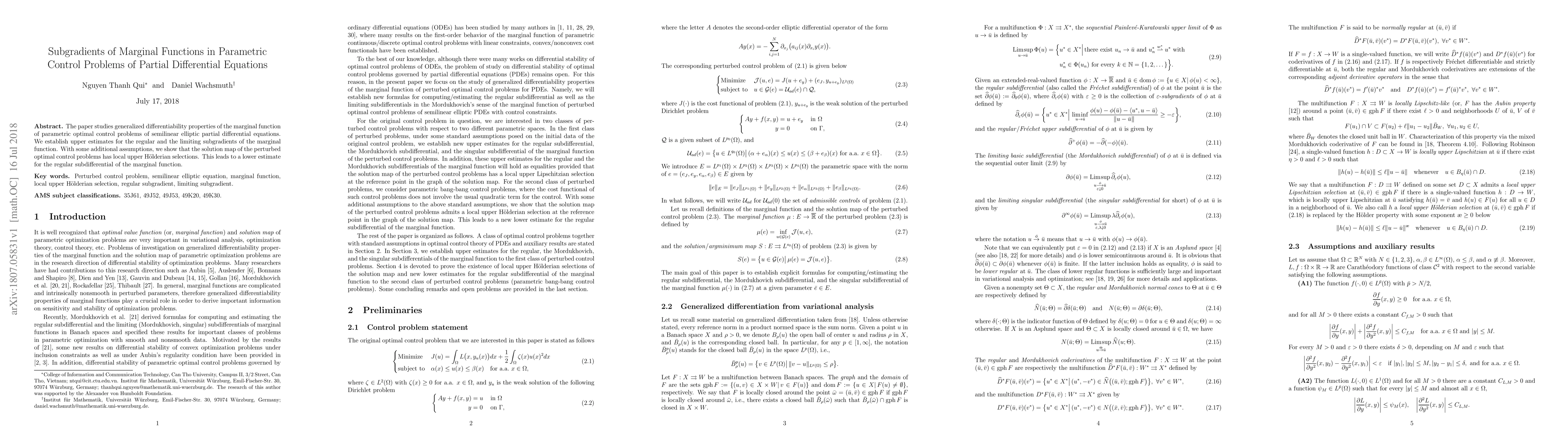 The paper investigates the generalized differentiability of marginal functions in optimal control problems governed by semilinear elliptic partial differential equations, establishing upper bounds for both regular and limiting subgradients. It also demonstrates local upper H\"{o}lderian selections for perturbed problems, resulting in a lower estimate for the regular subdifferential.