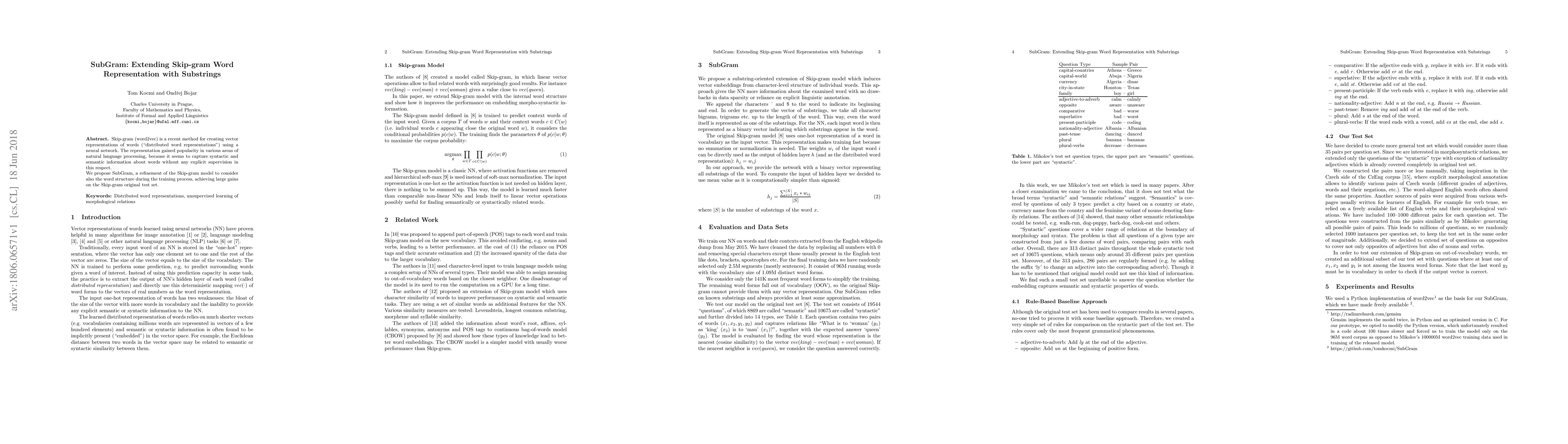 SubGram refines the Skip-gram model by incorporating substrings to better capture word structure, leading to improved performance on various natural language processing tasks. This approach enhances the original word2vec model by leveraging syntactic and semantic information implicitly encoded in word parts.