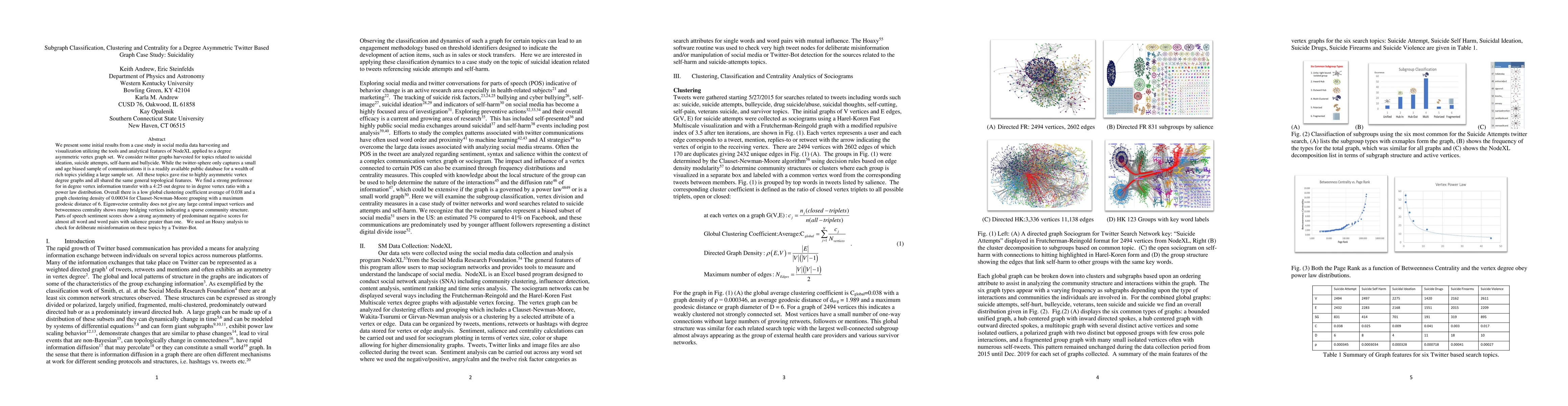 We present some initial results from a case study in social media data harvesting and visualization utilizing the tools and analytical features of NodeXL applied to a degree asymmetric vertex graph set. We consider twitter graphs harvested for topics related to suicidal ideation, suicide attempts, self-harm and bullycide. While the twitter-sphere only captures a small and age biased sample of communications it is a readily available public database for a wealth of rich topics yielding a large sample set. All these topics gave rise to highly asymmetric vertex degree graphs and all shared the same general topological features. We find a strong preference for in degree vertex information transfer with a 4:25 out degree to in degree vertex ratio with a power law distribution. Overall there is a low global clustering coefficient average of 0.038 and a graph clustering density of 0.00034 for Clauset-Newman-Moore grouping with a maximum geodesic distance of 6. Eigenvector centrality does not give any large central impact vertices and betweenness centrality shows many bridging vertices indicating a sparse community structure. Parts of speech sentiment scores show a strong asymmetry of predominant negative scores for almost all word and word pairs with salience greater than one. We used an Hoaxy analysis to check for deliberate misinformation on these topics by a Twitter-Bot.