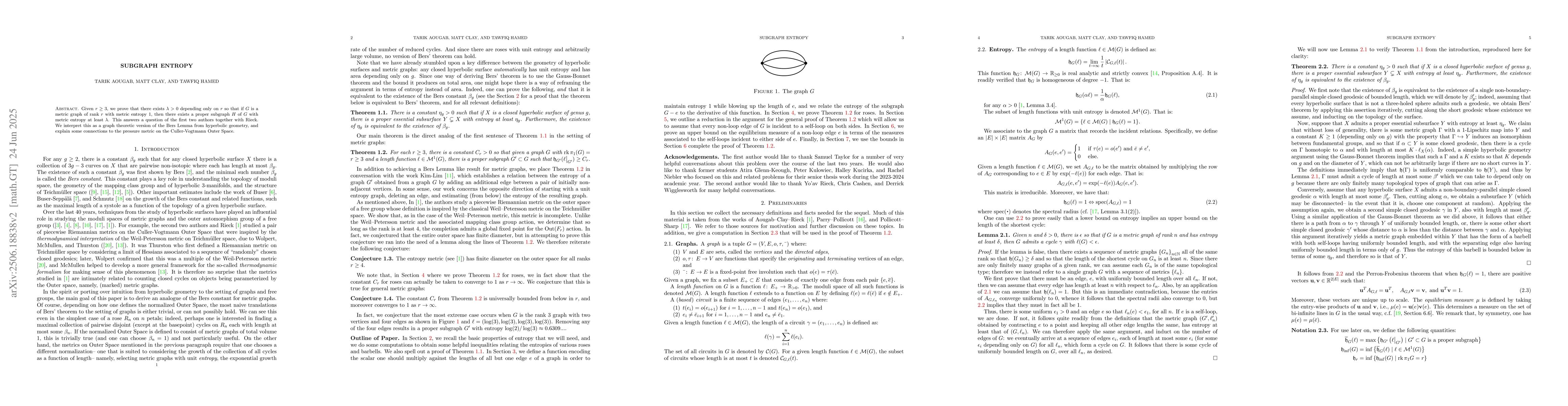The paper presents a novel proof technique for establishing the existence of subgraphs with non-zero entropy in specific classes of metric graphs, leveraging connections to hyperbolic geometry and the pressure metric.