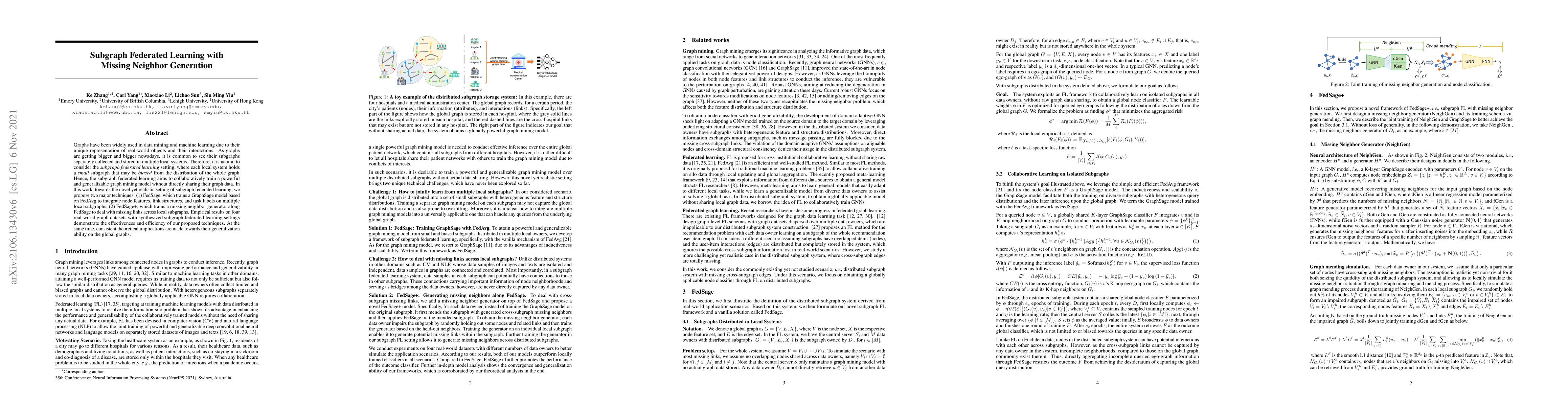 This paper proposes techniques for subgraph federated learning to collaboratively train a graph mining model across multiple local subgraphs without sharing data. The key methods include FedSage for integrating node features and link structures, and FedSage+ for generating missing links, demonstrating effectiveness and generalization on real-world datasets.
