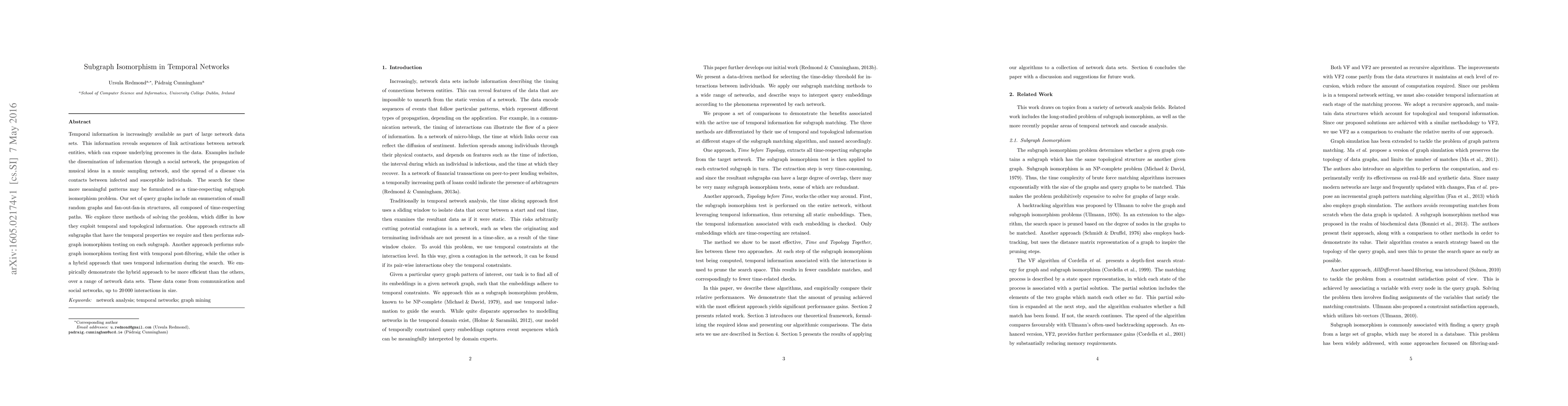 Temporal information is increasingly available as part of large network data sets. This information reveals sequences of link activations between network entities, which can expose underlying processes in the data. Examples include the dissemination of information through a social network, the propagation of musical ideas in a music sampling network, and the spread of a disease via contacts between infected and susceptible individuals. The search for these more meaningful patterns may be formulated as a time-respecting subgraph isomorphism problem. Our set of query graphs include an enumeration of small random graphs and fan-out-fan-in structures, all composed of time-respecting paths. We explore three methods of solving the problem, which differ in how they exploit temporal and topological information. One approach extracts all subgraphs that have the temporal properties we require and then performs subgraph isomorphism testing on each subgraph. Another approach performs subgraph isomorphism testing first with temporal post-filtering, while the other is a hybrid approach that uses temporal information during the search. We empirically demonstrate the hybrid approach to be more efficient than the others, over a range of network data sets. These data come from communication and social networks, up to interactions in size.