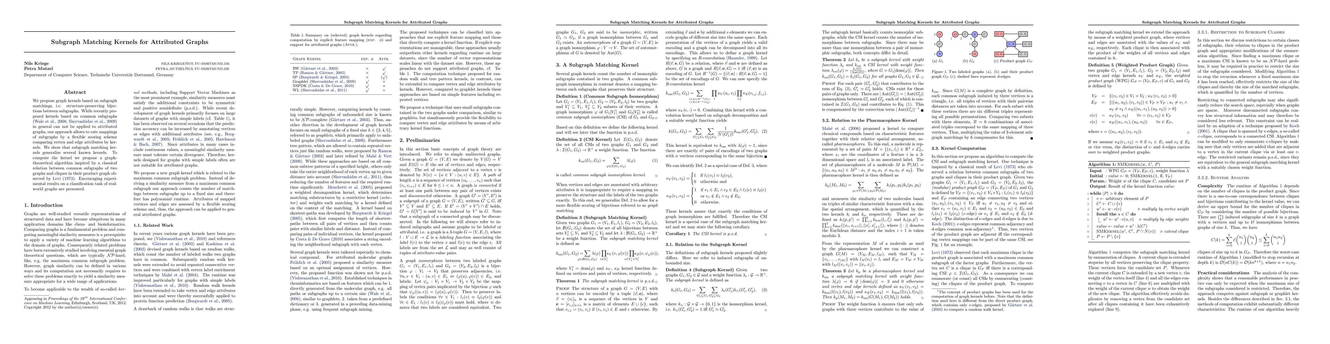 We propose graph kernels based on subgraph matchings, i.e. structure-preserving bijections between subgraphs. While recently proposed kernels based on common subgraphs (Wale et al., 2008; Shervashidze et al., 2009) in general can not be applied to attributed graphs, our approach allows to rate mappings of subgraphs by a flexible scoring scheme comparing vertex and edge attributes by kernels. We show that subgraph matching kernels generalize several known kernels. To compute the kernel we propose a graph-theoretical algorithm inspired by a classical relation between common subgraphs of two graphs and cliques in their product graph observed by Levi (1973). Encouraging experimental results on a classification task of real-world graphs are presented.
