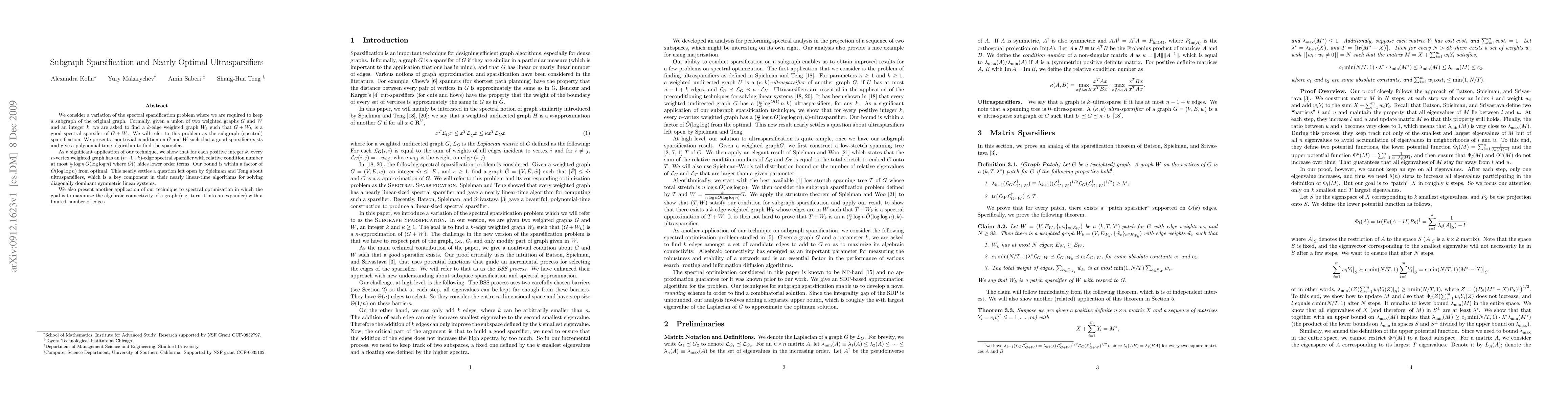 We consider a variation of the spectral sparsification problem where we are required to keep a subgraph of the original graph. Formally, given a union of two weighted graphs $G$ and $W$ and an integer $k$, we are asked to find a $k$-edge weighted graph $W_k$ such that $G+W_k$ is a good spectral sparsifer of $G+W$. We will refer to this problem as the subgraph (spectral) sparsification. We present a nontrivial condition on $G$ and $W$ such that a good sparsifier exists and give a polynomial time algorithm to find the sparsifer. %$O(\frac{n}{k})\log n \tilde{O}(\log \log n)$ As a significant application of our technique, we show that for each positive integer $k$, every $n$-vertex weighted graph has an $(n-1+k)$-edge spectral sparsifier with relative condition number at most $\frac{n}{k} \log n \tilde{O}(\log\log n)$ where $\tilde{O}()$ hides lower order terms. Our bound is within a factor of $\tilde{O}(\log \log n)$ from optimal. This nearly settles a question left open by Spielman and Teng about ultrasparsifiers, which is a key component in their nearly linear-time algorithms for solving diagonally dominant symmetric linear systems. We also present another application of our technique to spectral optimization in which the goal is to maximize the algebraic connectivity of a graph (e.g. turn it into an expander) with a limited number of edges.