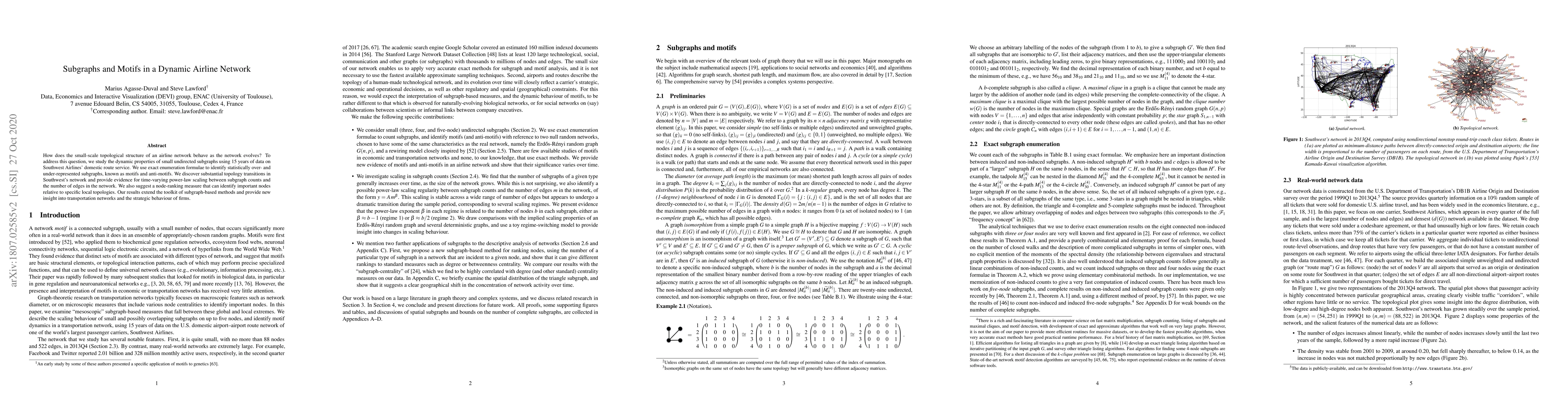This study investigates the dynamic topological structure of Southwest Airlines' domestic route network over 15 years, identifying statistically significant subgraphs and motifs. It reveals substantial topology transitions and time-varying power-law scaling, while proposing a new node-ranking measure for local network importance.
