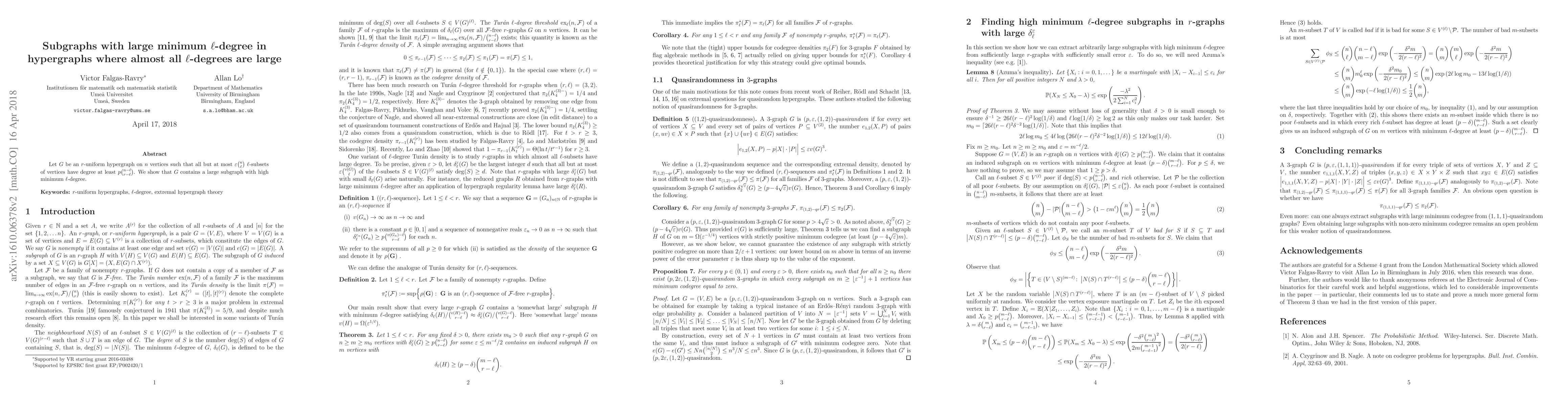 A hypergraph with most l-subsets of high degree is guaranteed to contain a large subgraph with high minimum l-degree. This result provides insight into the structure of such graphs.
