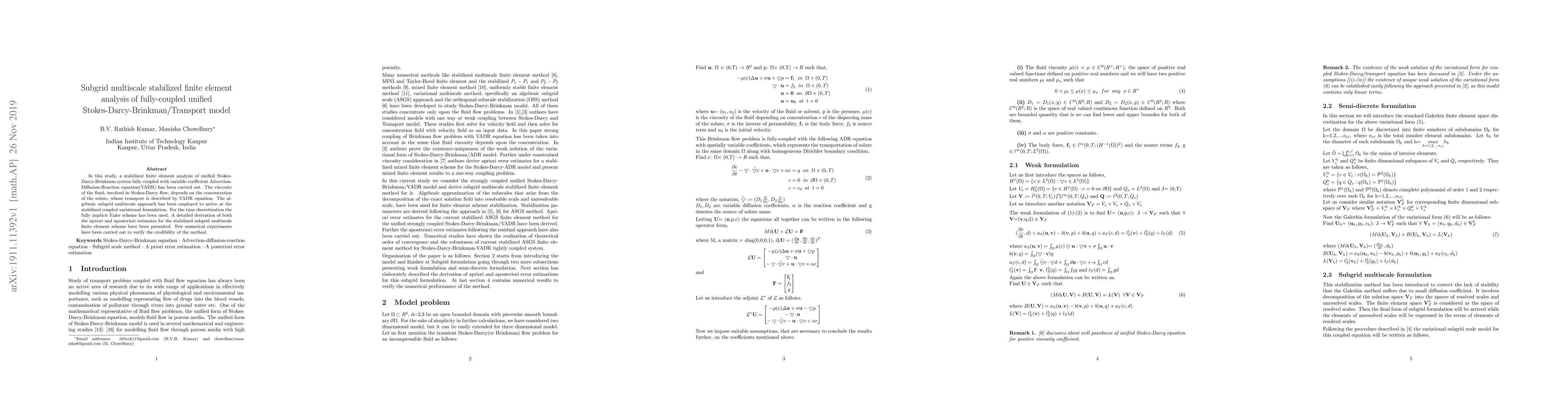The paper introduces a stabilized finite element formulation for a fully-coupled unified Stokes-Darcy-Brinkman/Transport model, incorporating an algebraic subgrid multiscale approach for error estimation and control.