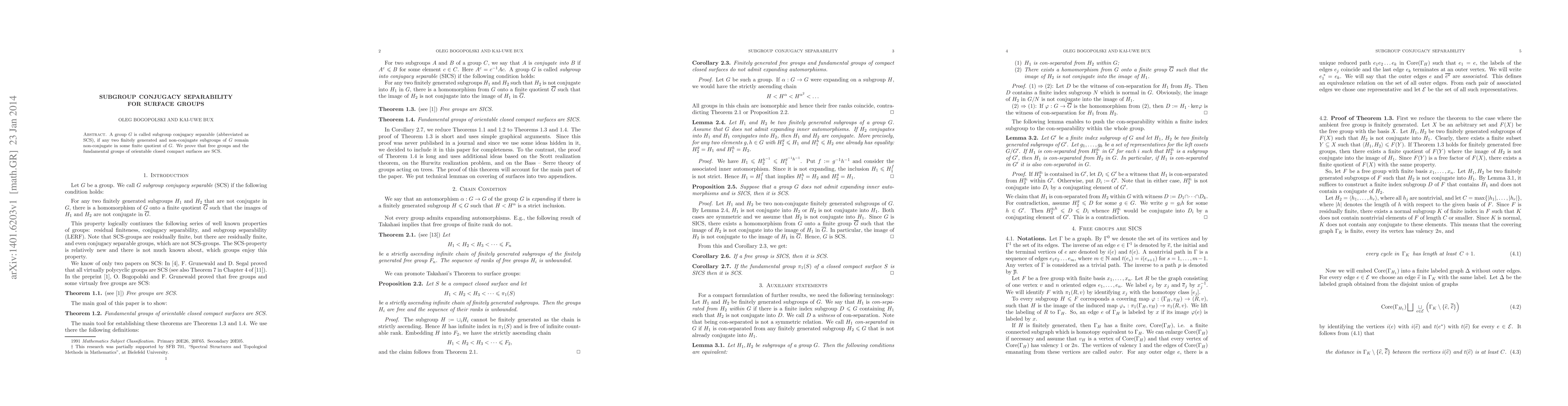 The paper proves that free groups and the fundamental groups of orientable closed compact surfaces exhibit subgroup conjugacy separability (SCS), meaning any two non-conjugate finitely generated subgroups remain non-conjugate in some finite quotient of these groups. This establishes SCS properties for these important classes of groups.