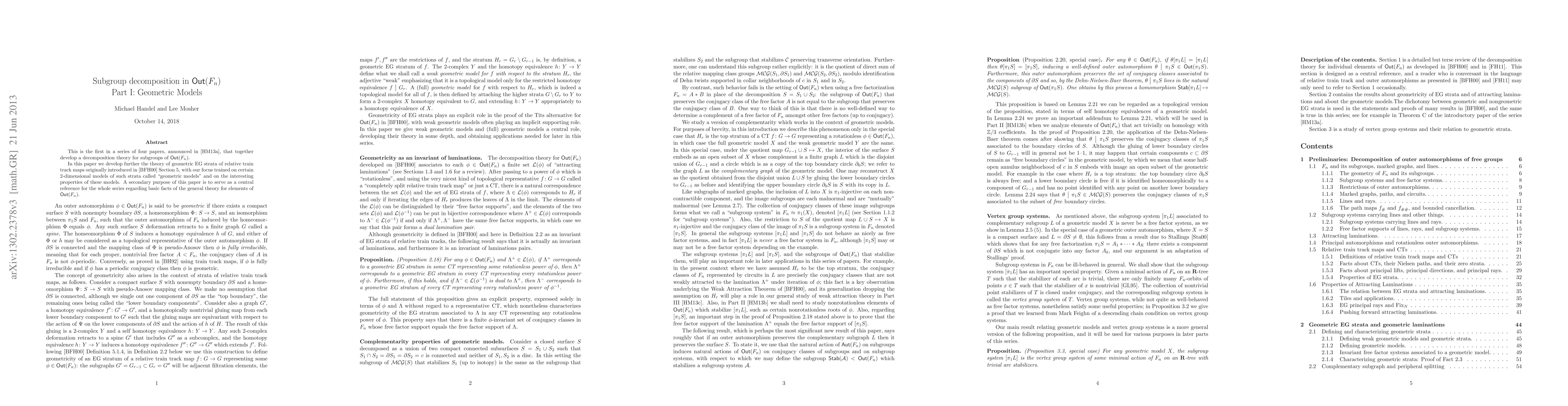 This paper introduces geometric models of EG strata for relative train track maps, focusing on their properties, and serves as a foundational reference for a series developing a decomposition theory for subgroups of Out(F_n). It builds on the work of Bestvina, Feighn, and Handel to explore the geometric aspects of these models.