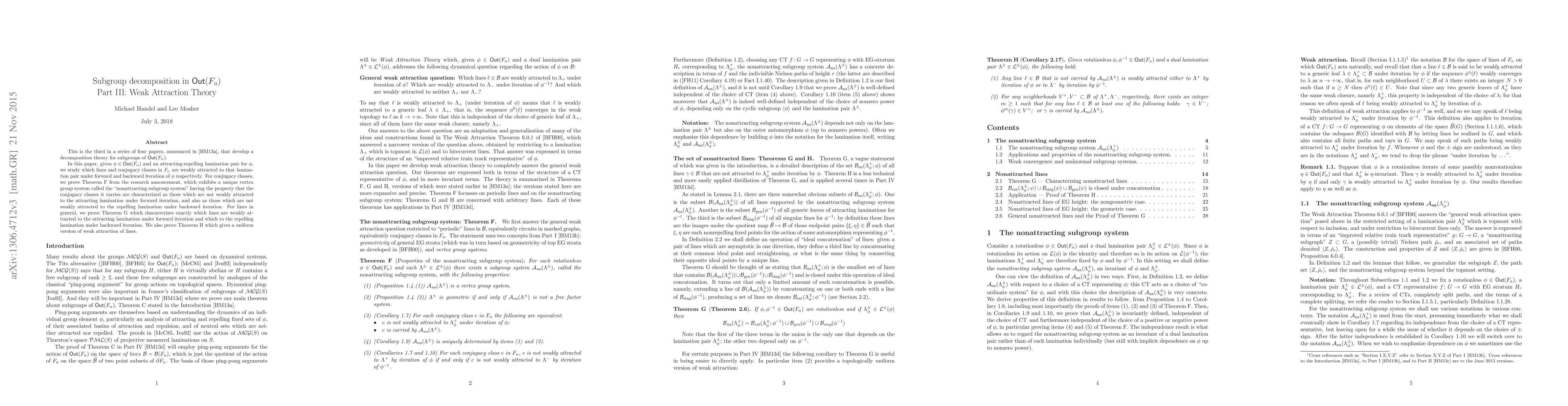 This paper develops subgroup decomposition theory for $\text{Out}(F_n)$ by studying weak attraction to lamination pairs. It proves Theorem F, identifying a unique "nonattracting subgroup system" for conjugacy classes not weakly attracted to laminations, and Theorems G and H characterizing lines weakly attracted to laminations under forward and backward iterations.
