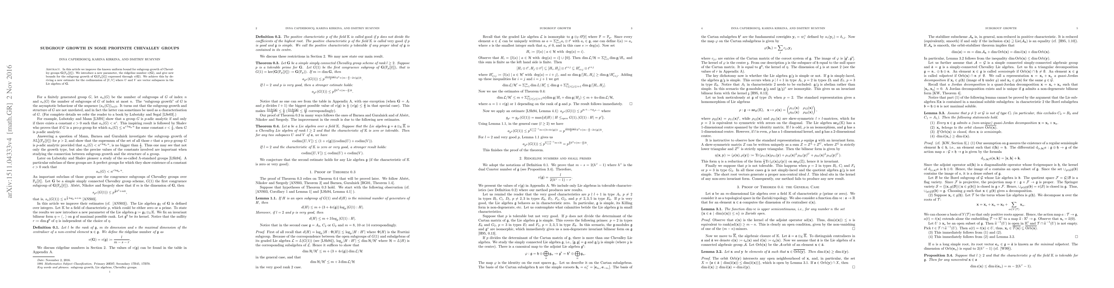 This paper improves the uniform bound for subgroup growth in profinite Chevalley groups over $\mathbf{G}(\mathbb{F}_p[[t]])$ by introducing the ridgeline number $v(\mathbf{G})$ and providing new bounds for subgroup growth expressed through this parameter. The improvement is achieved via a refined estimate of the codimension of $[U,V]$ in the Lie algebra of $\mathbf{G}$.