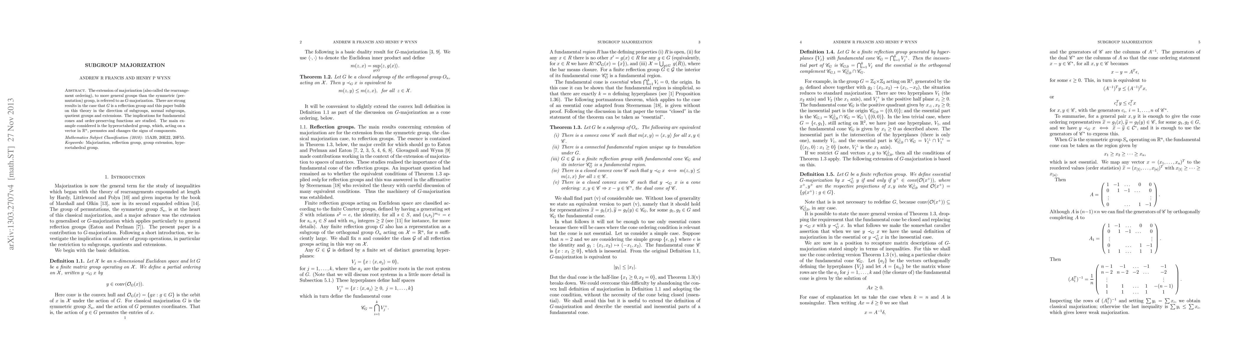 The extension of majorization (also called the rearrangement ordering), to more general groups than the symmetric (permutation) group, is referred to as $G$-majorization. There are strong results in the case that $G$ is a reflection group and this paper builds on this theory in the direction of subgroups, normal subgroups, quotient groups and extensions. The implications for fundamental cones and order-preserving functions are studied. The main example considered is the hyperoctahedral group, which, acting on a vector in $\mathbb R^n$, permutes and changes the signs of components.
