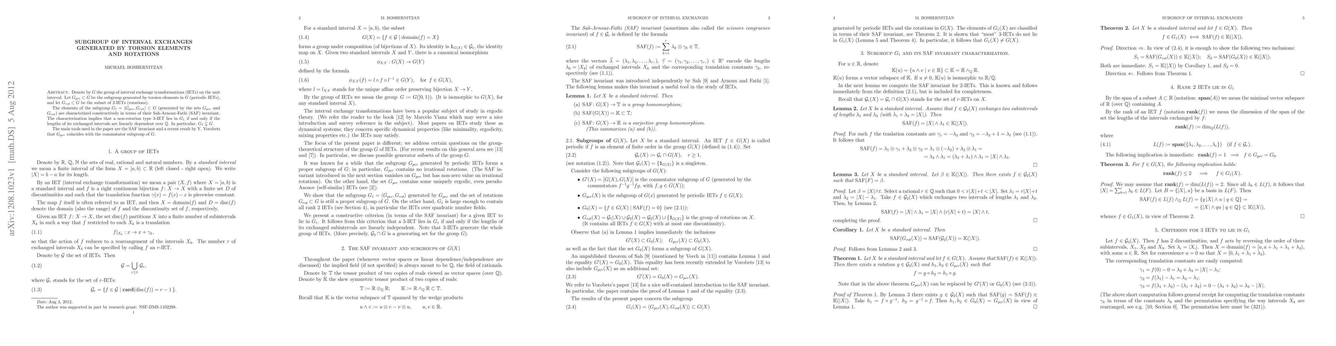 This paper characterizes the subgroup $G_1$ of interval exchange transformations generated by periodic elements and rotations, showing that a non-rotation type 3-IET belongs to $G_1$ if its exchanged intervals are linearly dependent over $\Q$. The study uses the SAF invariant and the result that $G_{per}$ is the commutator subgroup of $G$.