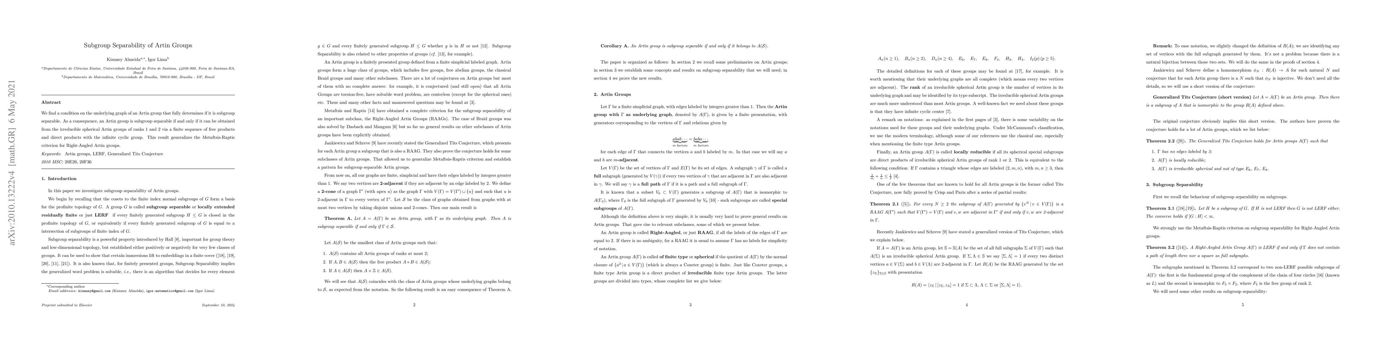 This paper establishes a condition on the graph structure of Artin groups to determine subgroup separability, showing that such groups are subgroup separable if derived from rank-2 Artin groups through a series of free and direct products with infinite cyclic groups. This extends the existing criterion for Right-Angled Artin groups.