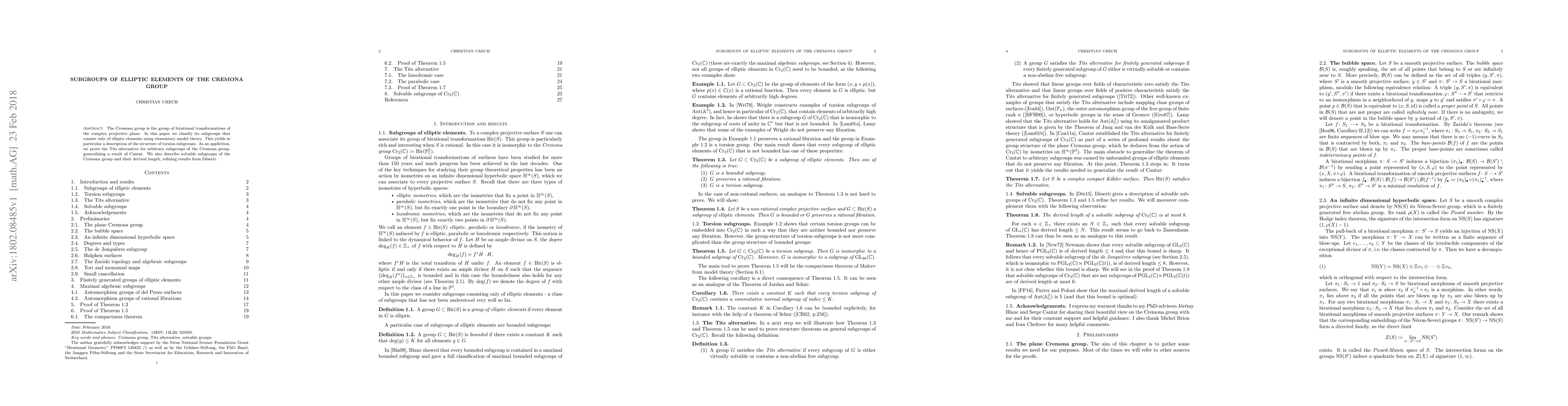 This paper classifies subgroups of the Cremona group composed solely of elliptic elements via elementary model theory, providing a detailed structure of torsion subgroups. It proves the Tits alternative for arbitrary subgroups of the Cremona group and refines the understanding of solvable subgroups and their derived length.