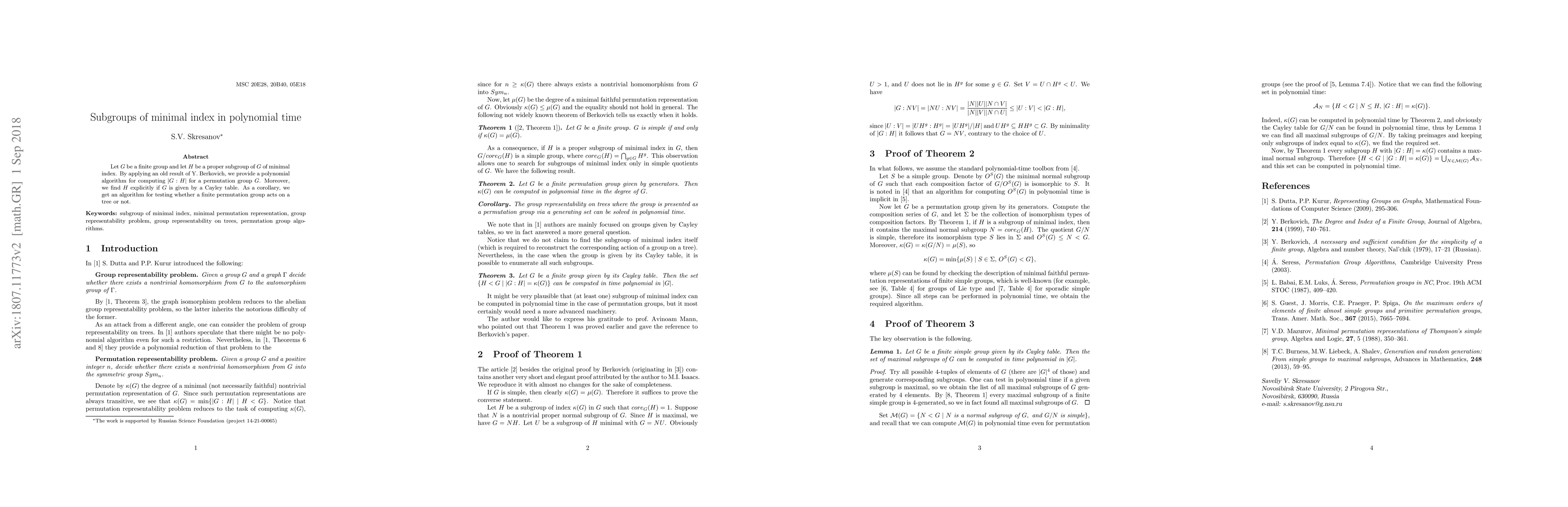 Let $G$ be a finite group and let $H$ be a proper subgroup of $G$ of minimal index. By applying an old result of Y. Berkovich, we provide a polynomial algorithm for computing $|G : H|$ for a permutation group $G$. Moreover, we find $H$ explicitly if $G$ is given by a Cayley table. As a corollary, we get an algorithm for testing whether a finite permutation group acts on a tree or not.
