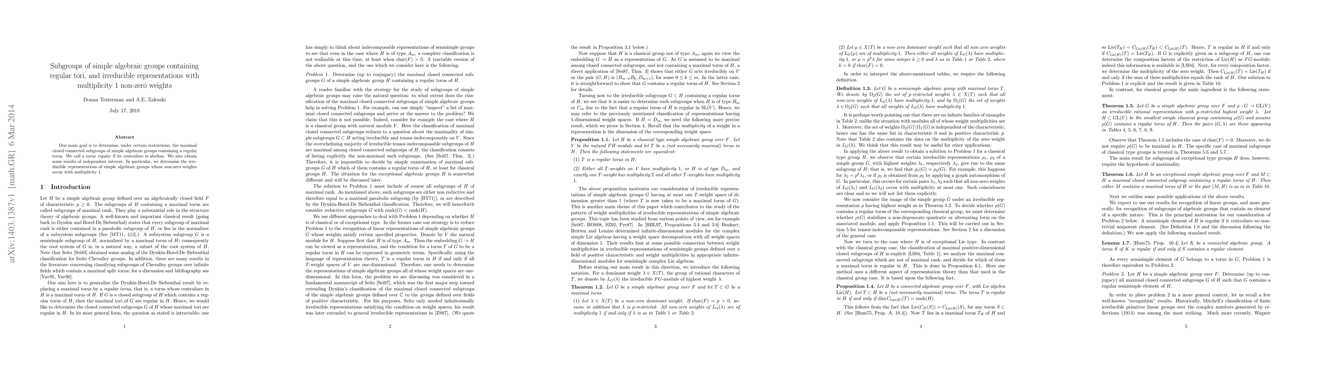 This research identifies the maximal closed connected subgroups of simple algebraic groups that contain a regular torus, defined by abelian centralizers. Additionally, it investigates irreducible representations where non-zero weights appear with multiplicity 1.