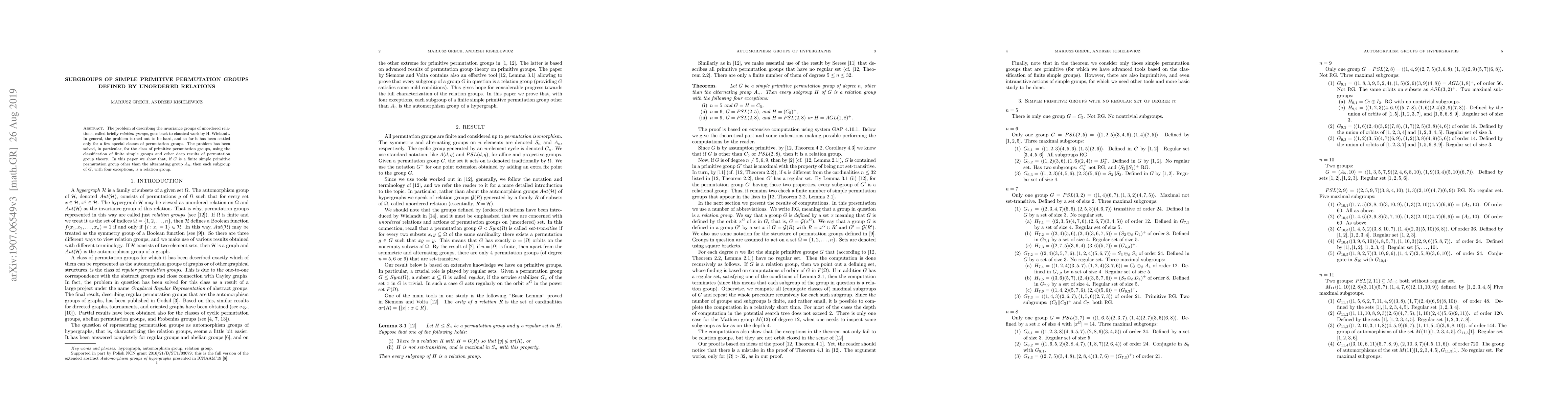 This paper addresses the classification of subgroups of finite simple primitive permutation groups, excluding $A_n$, by demonstrating that almost all such subgroups are "relation groups," defined by invariance of unordered relations. The exceptions are explicitly identified.