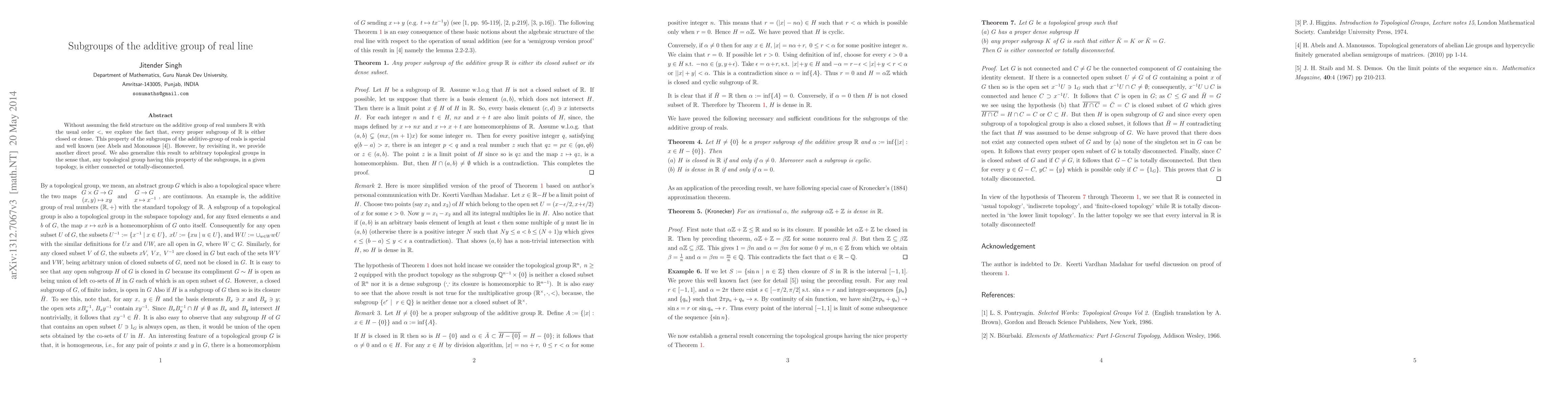 This paper examines subgroups of the additive group of real numbers, proving that every proper subgroup is either closed or dense. The authors also generalize this finding to any topological group, showing that such groups are either connected or totally disconnected.