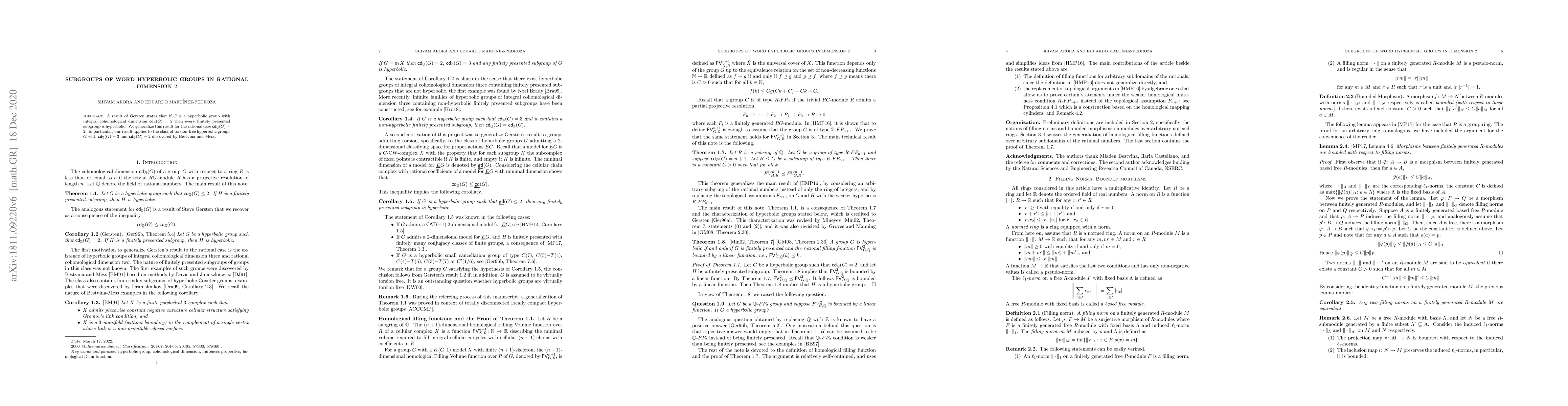 This paper generalizes Gersten's result on hyperbolic groups to the rational dimension case, proving that any finitely presented subgroup of a torsion-free hyperbolic group with $\mathsf{cd}_{\mathbb{Z}}(G)=3$ and $\mathsf{cd}_{\mathbb{Q}}(G)=2$ is also hyperbolic.