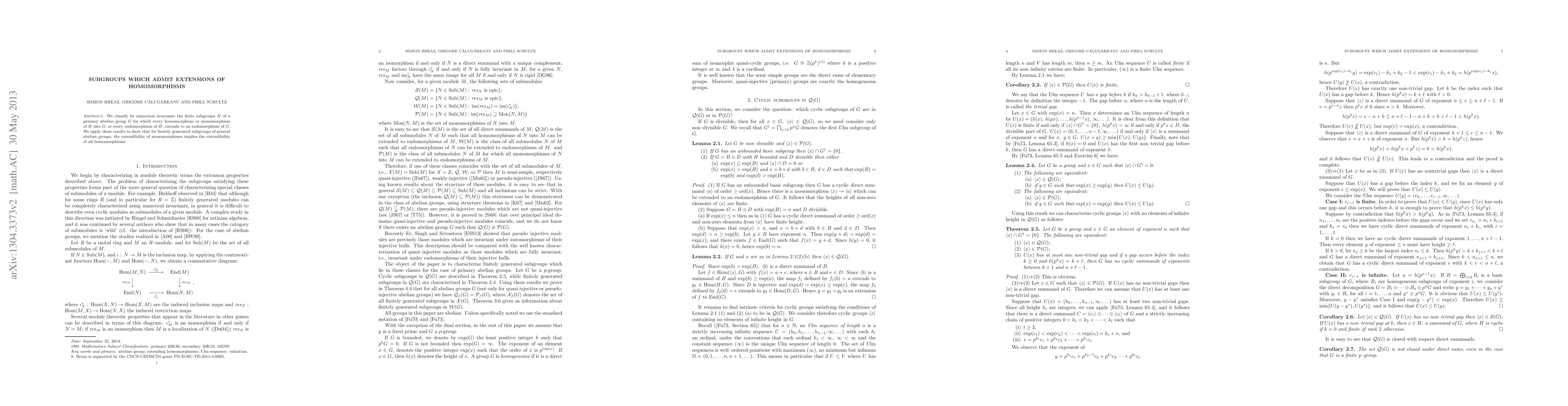 This paper classifies finite subgroups of primary abelian groups that allow all homomorphisms or monomorphisms from these subgroups to extend to endomorphisms of the entire group. The results demonstrate that for finitely generated subgroups in general abelian groups, extendibility of monomorphisms implies extendibility of all homomorphisms.
