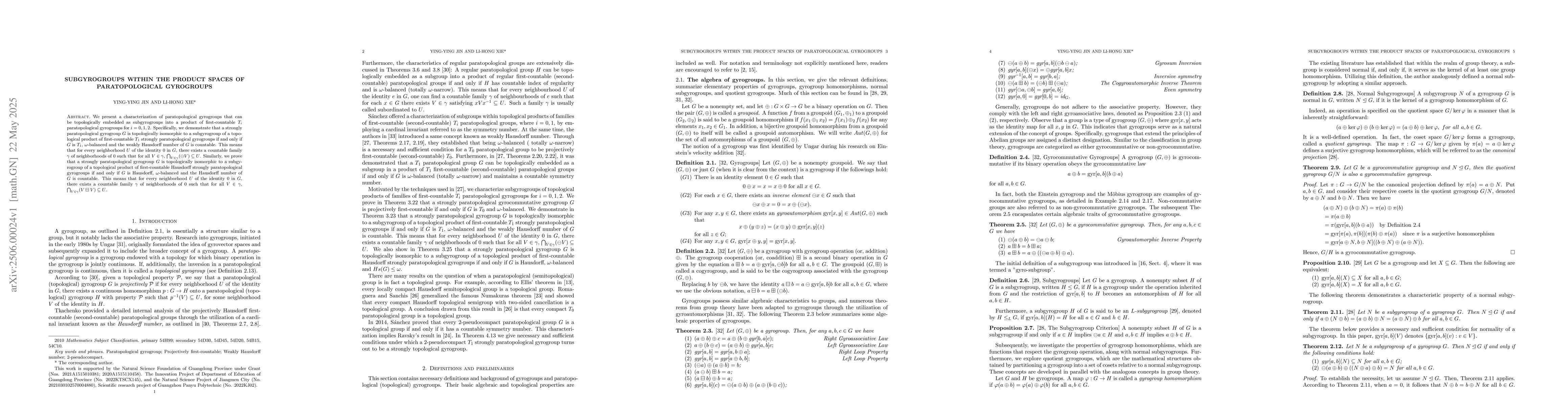 A research paper characterizes paratopological gyrogroups that can be embedded as subgyrogroups into a product of first-countable gyrogroups with specific conditions on topological properties such as $T_1$, $ heta$-balance, Hausdorff number, and weakly Hausdorff number.