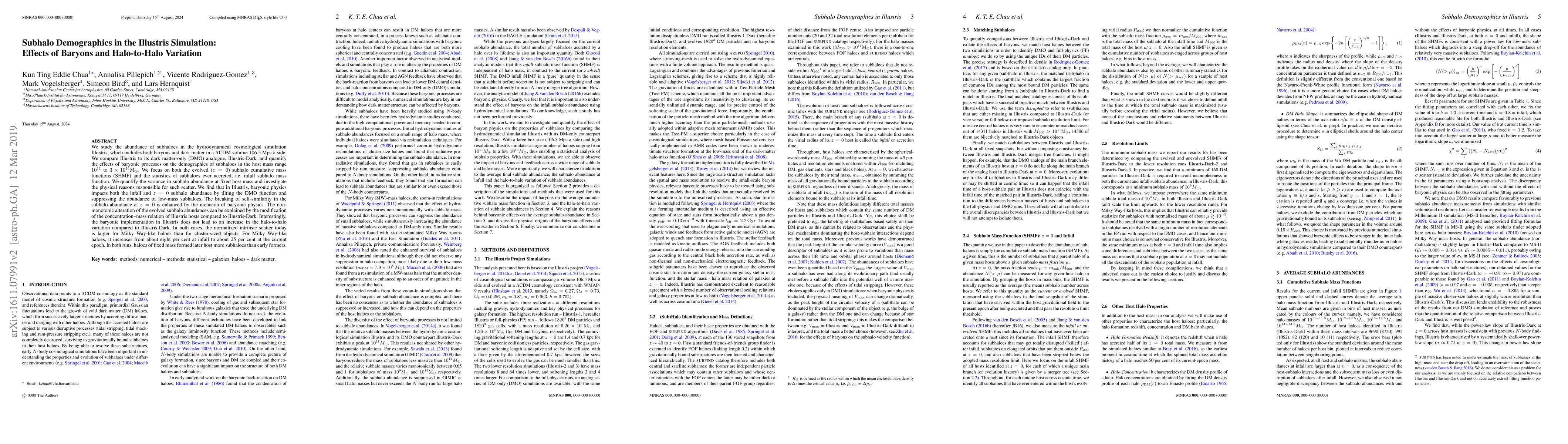 This study examines the impact of baryonic physics on subhalo demographics in the Illustris simulation, finding that baryons suppress low-mass subhaloes and break self-similarity in the subhalo abundance at $z=0$. Despite these effects, the inclusion of baryons does not increase halo-to-halo variation compared to the dark matter-only counterpart.