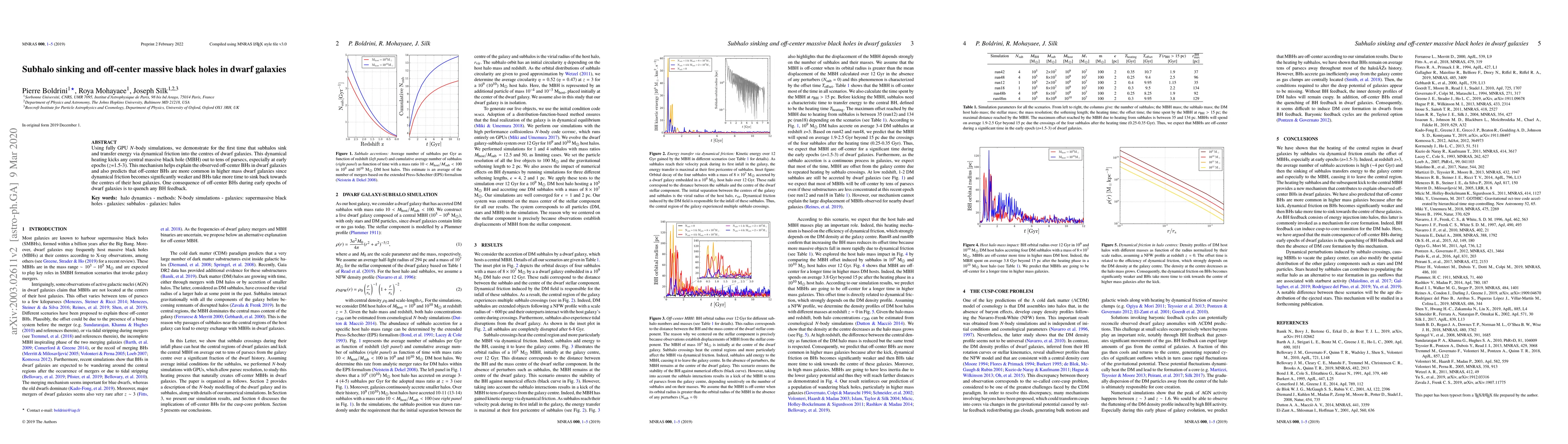 This paper uses GPU $N$-body simulations to show that subhalos sink into dwarf galaxies, dynamically displacing central massive black holes (MBHs) to off-center positions, especially in early epochs. This mechanism explains observed off-center MBHs and predicts their prevalence in higher mass dwarf galaxies.