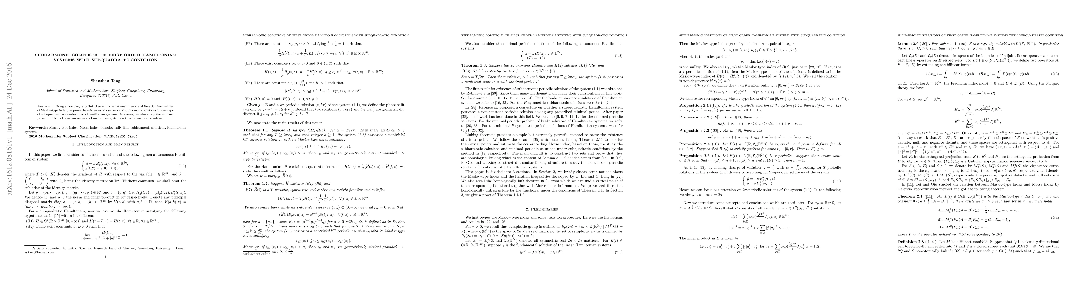 Researchers prove the existence of subharmonic solutions for certain Hamiltonian systems with a subquadratic condition, using homological link theorems and Maslov-type index inequalities.