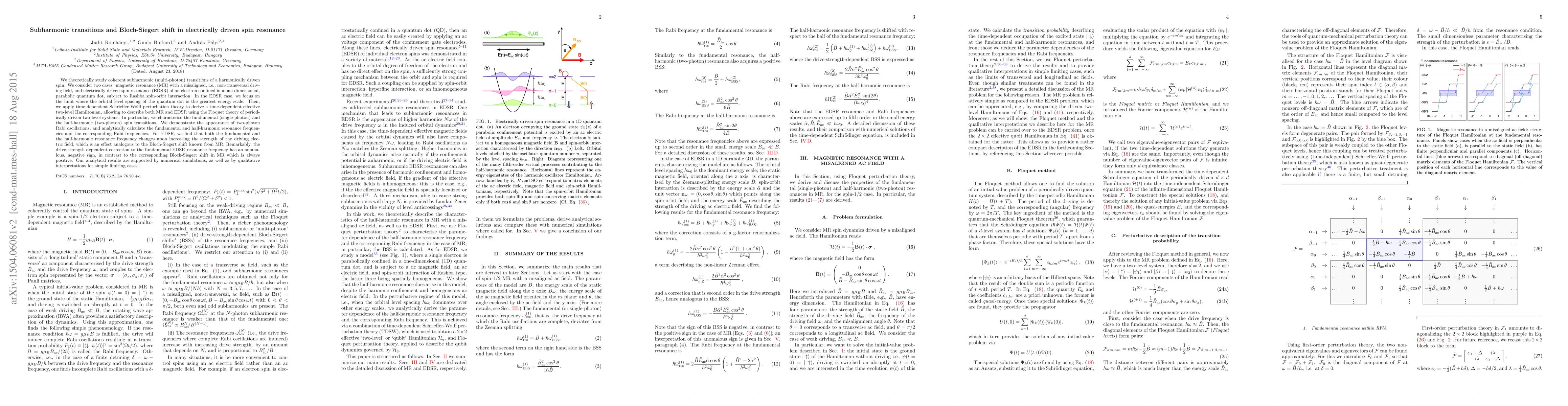 This paper theoretically investigates coherent subharmonic transitions in a harmonically driven spin, comparing magnetic resonance with a non-transversal field and electrically driven spin resonance in a quantum dot. It reveals the Bloch-Siegert shift effect in EDSR, with an anomalously negative correction to the resonance frequency under strong electric fields.