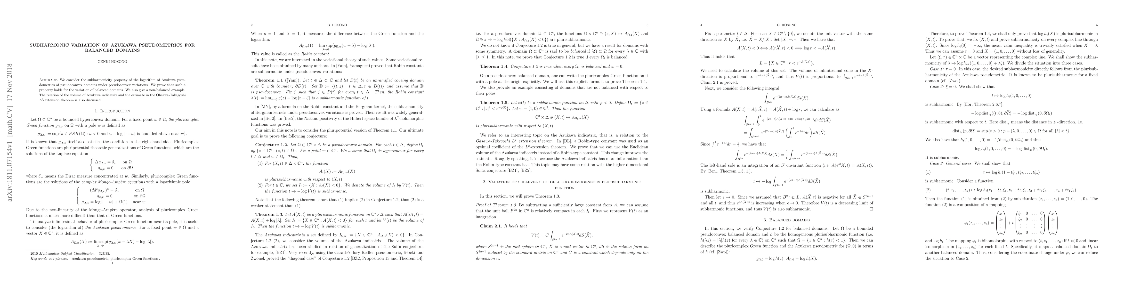 We consider the subharmonicity property of the logarithm of Azukawa pseudometrics of pseudoconvex domains under pseudoconvex variations. We prove that such a property holds for the variation of balanced domains. We also give a non-balanced example. The relation of the volume of Azukawa indicatrix and the estimate in the Ohsawa-Takegoshi $L^2$-extension theorem is also discussed.
